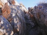Aparecen poco excavados, insinuados apenas, barrancos que no llegan a ser profundos ni sombríos, tajaduras del terreno que lluvias estacionales han ido marcando. Calor, sudor, los noticiarios hablaban esta mañana de máximas de 12 o 13 grados, pero es fácil que a esta hora, con el sol encaramado en todo lo alto, se sobrepasen los 15. Precisaré, cuando haya ocasión, un baño refrescante. Encuentro entre las grietas de unos peñascos una toalla escondida que me viene al pelo –una casualidad más de las muchas que me depara el camino-, puede ser un olvido reciente de alguno de los corredores que me adelantan, la cuelgo pues bien visible en el asa de la mochila, por si se me cruzarme con su despistado dueño.