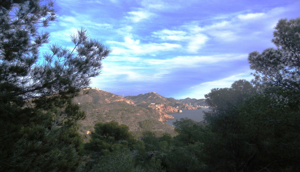 Tres cuartos de hora después alcanzo a 220 m de altitud un collado, el paisaje cambia radicalmente al otro lado, surgen pinedas detrás, bosquecillos; a poniente. Arranca una senda hacia la derecha que debe llegar hasta la batería de La Torrosa, hay una calita debajo con una islita enfrente unida con un tómbolo a ella. Después tendría que salir por La Parajola, que antecede al acuartelamiento de Algameca Grande, donde está radicado el CBA (Centro de Buceo de la Armada), pero desisto porque terminaría adentrándome demasiado en zona militar. A la izquierda otra encamina a las inmediaciones de Collado Roldán, para rodearlo a media altura y bajar por un camino ancho hasta la carretera de Tentegorra y Los Garcías. Queda una tercera opción, que es la que elijo, la senda que se apunta al frente, más o menos visible a tramos, que por una vaguada desciende hacia las inmediaciones de Cartagena.