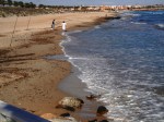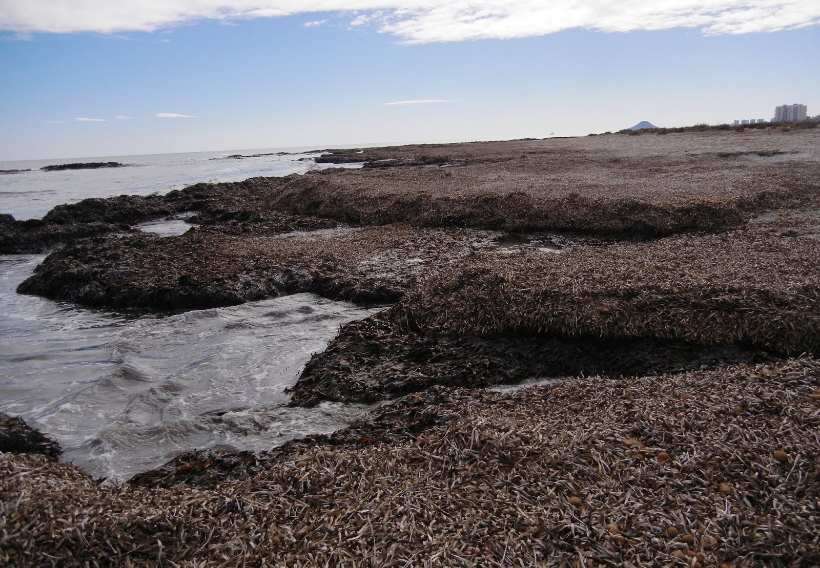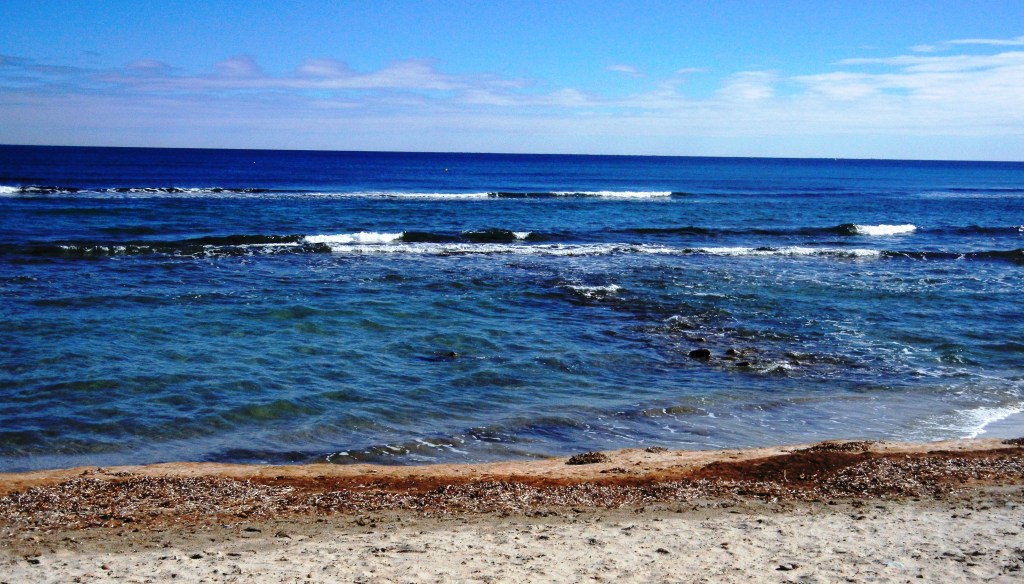 Celebro el Mediterráneo por fin entero, marítimo. Charco, sin embargo, porque apenas insinúan movimiento sus olas. Playazo –este de arena finísima no tan basta como en el de Vera, que tan lejano me resulta ahora- lleno de algas que aportan los temporales de la última semana, bolitas de pelusilla pajiza, escobillas y brochas de posidonia, esquejes que libera para dispersarse. Escalones antiguos de sus cintas oscuras levantan pequeños morros de contención que construyen playa.