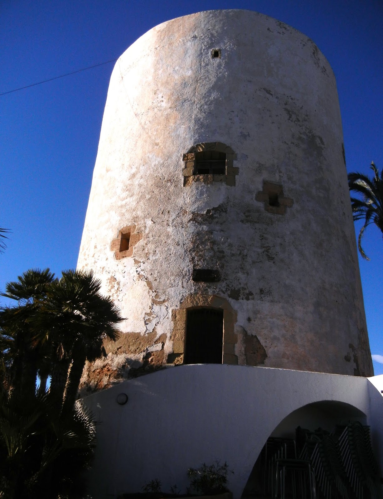 Sin solución de continuidad atravieso una serie de urbanizaciones que habrán de llevarme hasta Torrevieja. Pueblo Latino, Mil Palmeras. Dehesa de Campoamor. Punta de la Glea. La Regia. Cabo Roig… ¡alto, hay que hacer un inciso aquí! He recorrido una legua, unos 5,5 km, desde La Horadada y debe ubicarse otra torre en este punto, eso dictaba las disposiciones del sistema defensivo costero. Efectivamente se levanta imponente, redonda, ataludada, muy cerrada, apenas sin vanos y con troneras de buzón (horizontales) hacia los cuatro puntos cardinales: la torre de Cabo Royo (según Escolano), de cabo Roig (o rojo, actualmente).