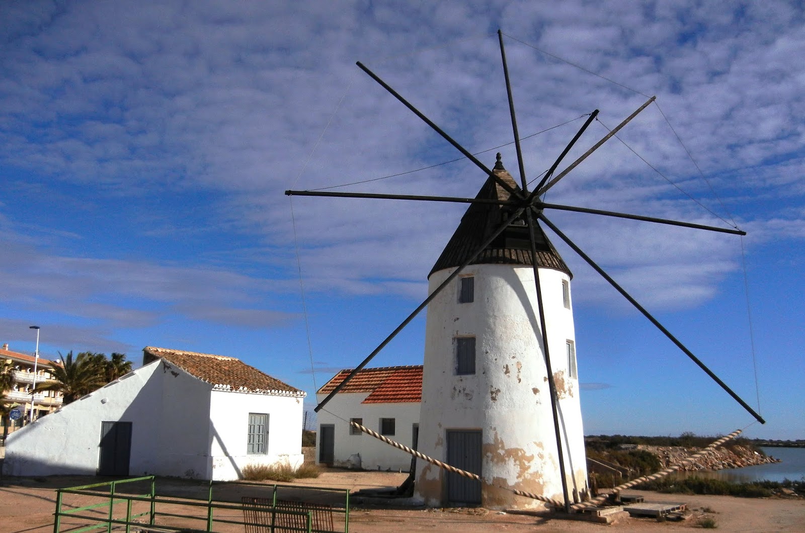 Parto del Molino de Quintín a las 10,30 h, en el mismo sobaco de La Manga, si se le puede llamar así, junto a los productivos y turísticos barros de Lo Pagán. Recorro una recta perfectamente adoquinada en dirección al del extremo inferior de esta parte de La Manga, por el interior, hacia las encañizadas. Acondicionada para el paseo vacacional, con carril bici, paneles informativos, pasarelas de acceso al baño y demás aditamentos, se nota que es una parte del litoral muy concurrida, incluso ahora en invierno.