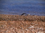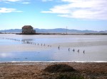Una bandada de cormoranes, con algunas gaviotas, se elevan sobre el agua para dejarse caer, bucear y volver a emerger, rebuscando su desayuno entre un cardumen de peces bien localizado. Al acabar se alzan dibujando un arco en el aire para aprovechar ráfagas que soplan de poniente, encaminándose hacia mar abierto. Me sobrevuelan y puedo apreciar a los jóvenes con una mancha blanca en cuello y cuerpo, bajo las alas; totalmente oscuros los adultos. Pastan crinoideos y larvas de mosquito y mosca cerca de la Torre del Estacio las bandadas de flamencos, aparece alguna espátula, una grulla.