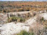 Afortunadamente después de esos mojones de ladrillo, de esas descomunales deposiciones, se impone de nuevo la prodigiosa inmensidad de esta zona de costa y mi sensación de grandeza asociada a ella. Campos de dunas van surgiendo, más esbeltas, crecidas por el aislamiento, aparecen alambradas sujetadas con estacas que pretenden, y parece que en parte lo logran, detener el alocado avance de las arenas, que contienen el empuje que siempre tuvieron. Debió alzarse por aquí, aunque no se conoce el emplazamiento exacto, la torre del Pinatar o torre Derribada, quizás terminaron tragándose sus restos las dunas. Transito territorios del Parque Regional de las Salinas y Arenales de San Pedro del Pinatar.