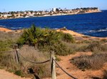 Bajo su sombra arranca una senda escavada en los cortados muy arreglada, pasa junto a dos islotes (el del Escullano y el del Carmen). Prosigo mi caminar zigzagueante, entrecortado, que imponen los obstáculos. Como otras veces coqueteo con el mareo, dudando entre parar a repostar o proseguir hasta el final, sigo, no quiero alterarme el ritmo. Salientes y entrantes, abro y cierro paréntesis en una secuencia hipnótica, mareante, sin mirar al tendido, al ladrillo, quiero decir, con ojos solo par el agua. Quedan en el retrovisor La Zenia, Playa Flamenca I y II, avisto Punta Prima, stop, un hueco, un remanso de naturaleza por fin.