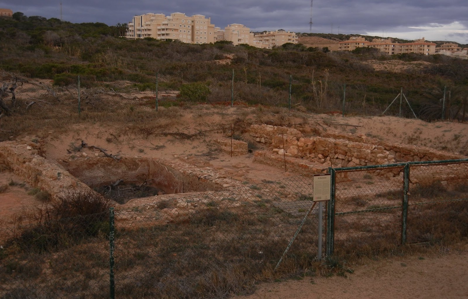 Desde una curva hacía atrás, al sur, que describe el río avisto las murallas del castillo. Cerca existe un importantísimo asentamiento fenicio del VI a C, La Fonteta, perfectamente conservado al haber sido engullido por las dunas, hoy excavado y visitable, era una colonia metalúrgica del cobre, hierro y plata (cuyos pobladores procedían del Cabezo Pequeño del Estaño, un par de kilómetros más al interior, cuyo emplazamiento había sido destruido en el VIII a C. por un terremoto), sobre el que se superpone una rabita islámica (monasterio) con mihrab, minaretes, etc.