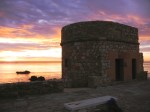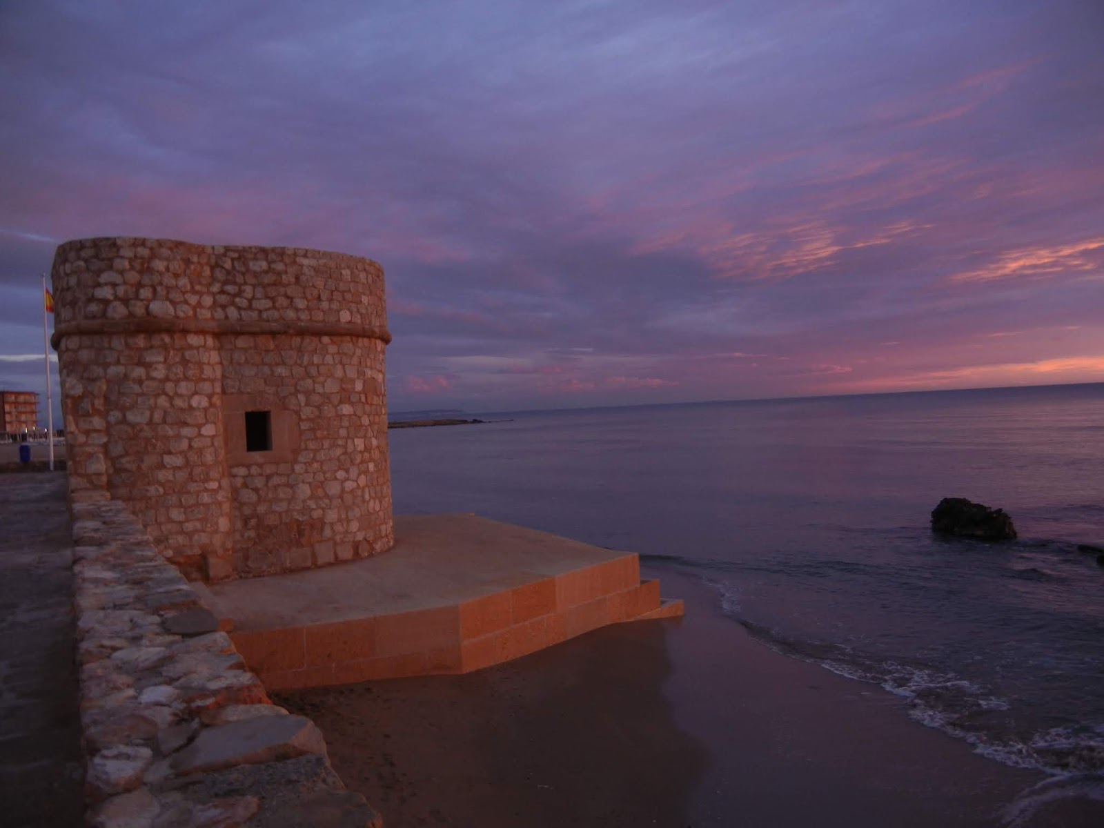 Amanece a las 7.30 h, amanezco yo también, ya tengo cogido el horario senderista. Desayuno y me llego hasta la playa de Torre de la Mata, sobre las 8,00 h, con las últimas hebras de la noche refulgiendo en el cielo comienzo a fotografiarla, es una torre mocha que da nombre al pueblo, barriada de Torrevieja en realidad. Bien poco se puede decir de ella dada su escasa entidad y lo muy restaurada que aparece.