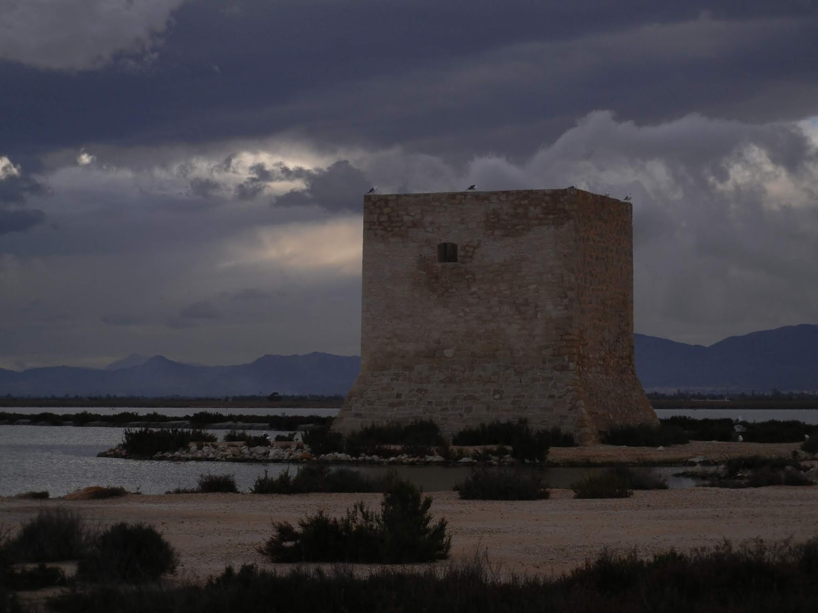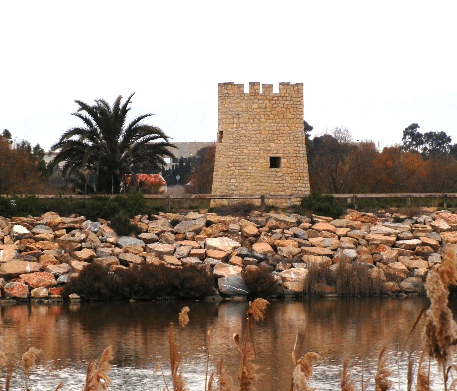 Sigo por la carretera entre una lluvia fina que baja algunos grados la temperatura del ambiente, llego a la Torre del Tamarit, muy restaurada, irreconocible (se caía a pedazos hace unos años, desdentada y roída como encía de abuela). Supongo que se imponía conservarla, pero su antigua imagen le confería otro aspecto más interesante que el de postal turística que ahora posee, desde luego constituye un excelente posadero de gaviotas, que increpan con sus estentóreos gritos al paseante. Su emplazamiento al interior parece indicar una función defensiva más que de vigilancia, protegiendo la entrada de la albufera de Elche.