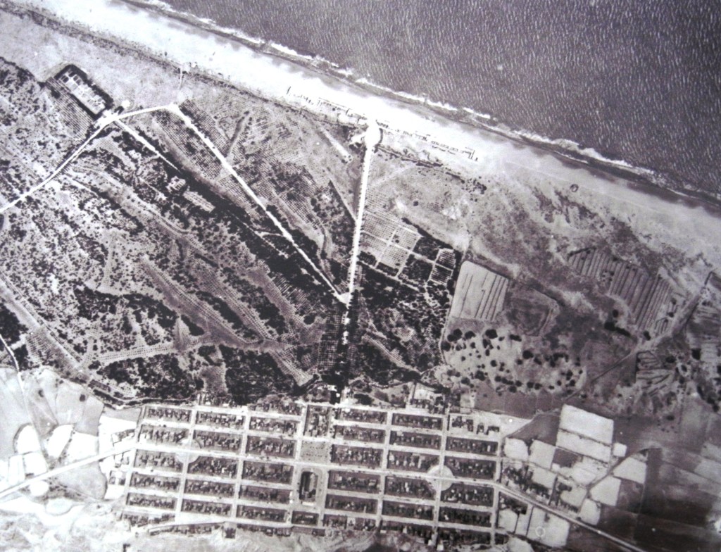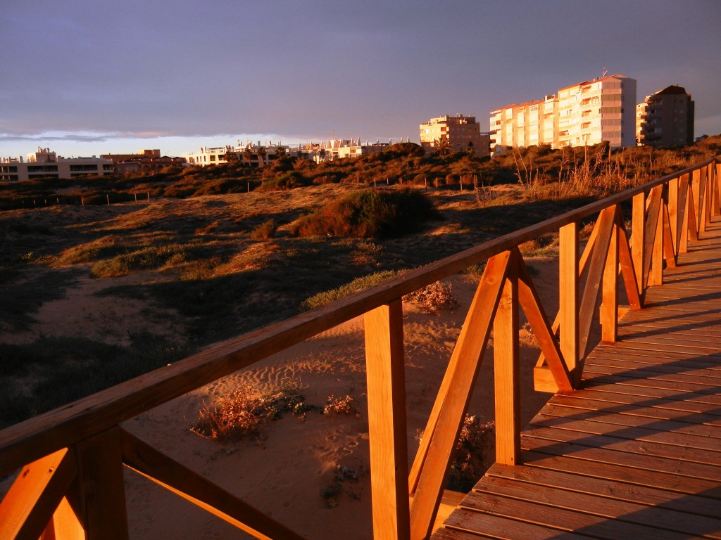 Todo este extenso y prolongado litoral que contemplo, caso de no ser rocoso, está formado por tres zonas bien diferenciadas: anteplaya, playa y duna. Las dunas se forman a partir de los sedimentos que aportaban el irregular cauce del Segura y el Vinalopó. El mar no puede admitir semejante carga de aportes y arrojaba el exceso de arena a su orilla, donde el viento de levante se encargaba de ir moviéndolas lentamente hacia el interior formando sucesivas oleadas de dunas móviles en frentes secuenciados, hasta que un obstáculo, el bosque, unas construcciones, las detiene –si no pueden engullirlo. Por eso, y también por seguridad ante ataques piratas, cuando se pretendió levantar aquí un poblado, Guardamar del Segura, se hizo en el interior, a un kilómetro, en torno al castillo que aprovecha un resalte montuno de unos 60m. Se estimuló la llegada de nuevos colonos con la concesión de terrenos para construir sus casas junto a la playa siempre que fueran capaces de retener el avance dunar (como muy bien documenta una exposición de paneles fijados en las paredes que tendré ocasión de ver más adelante).