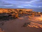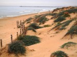 Comienza a refrescar como si el cielo, apiadándose, quisiera refrescar también mis costuras. Puedo ver desde atrás, desde una perspectiva más amplia, el campo de dunas, los manchones de pino y eucaliptus se apiñan en pequeños bosquecillos, los taráis y arbustos salpican las hondonadas. La lluviame reconcilia otra vez con la caminata. Una talabartera de madera me conduce de nuevo al mar. Me cruzo con dos extranjeros mayores, pareja, con tres perros: coliee madre con el hijo y labrador (esta raza siempre despierta sentimientos amables, llego a suponer que el dueño se parece siempre a su perro), van paseándolos o viceversa, lanzándoles palos. En la orilla un cormorán pesca, unas fochas negras de penacho blanco en la cabeza pasean, observa una grulla.