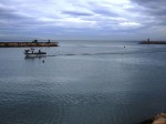 El mar, a mi lado, de mi mano -o yo de la suya más probablemente-, ha encontrado definitivamente el color que envidiaba del cielo -¿o es al revés?-. No se divisa el horizonte, apenas lo puedo intuir. Es plomo, todos los colores acuerdan fundirse en una fría ebullición a una tonalidad próxima al plomo. El verde oscuro metálico del agua se resiste y rafaguea tonalidades similares a las del cielo, embrumándolo todo a la vista, disolviéndolo, como en un paisaje norteño, solo interrumpido por las bollas de los criaderos de pescado y, ahora sí, ahí delante, con su negra y chata elevación, Tabarca, recortándose asoma como una bacalá secándose al sol, como una alfombrilla. Destaca el poblado en un extremo, sus detalles, creo adivinar incluso destellos blancos del oleaje que choca contra su costado, pero no puede ser a esta distancia, han de ser imaginaciones mías.