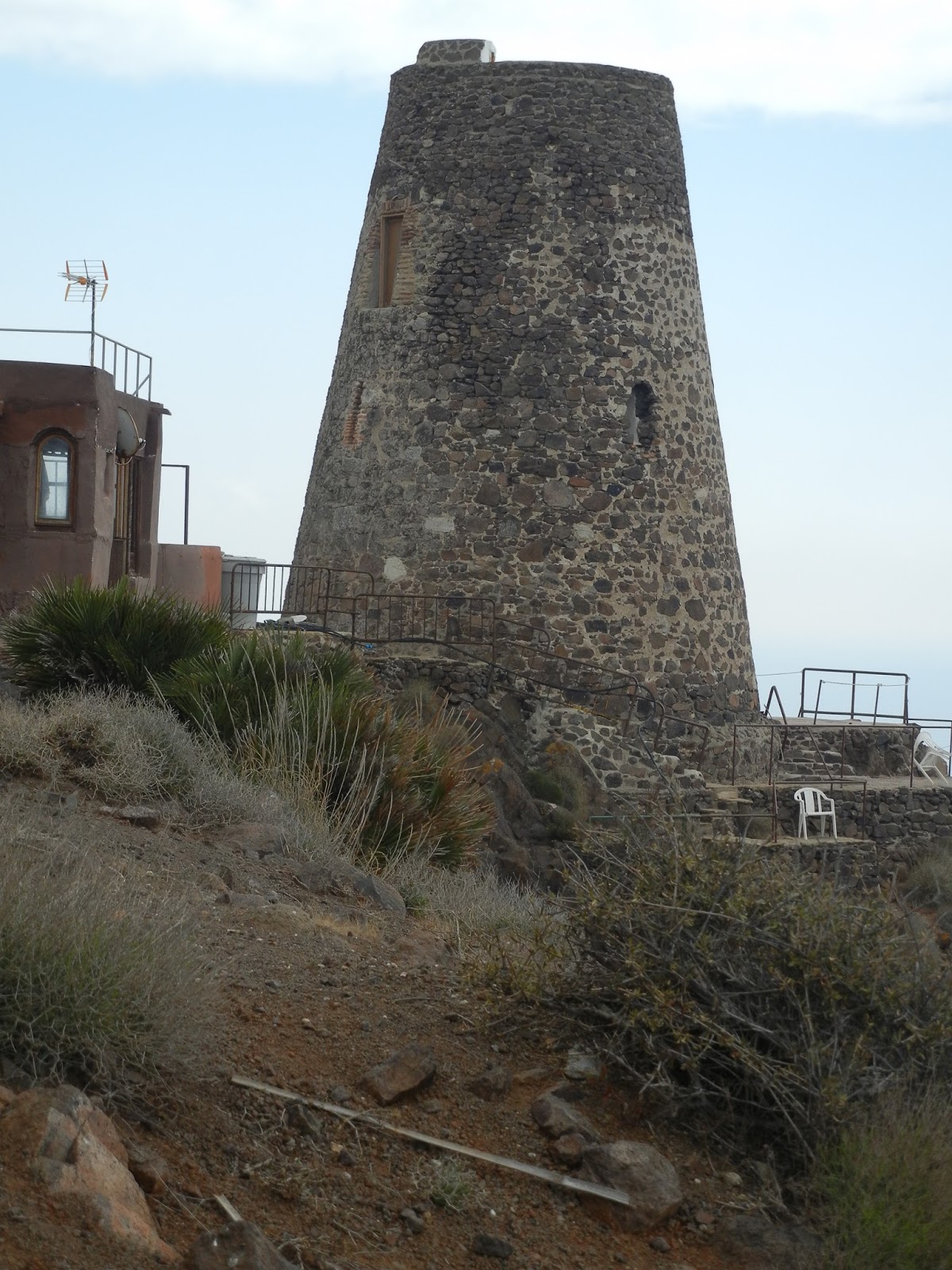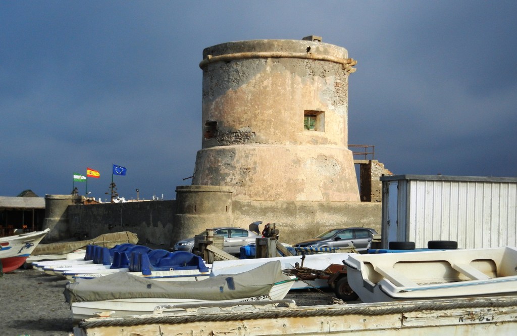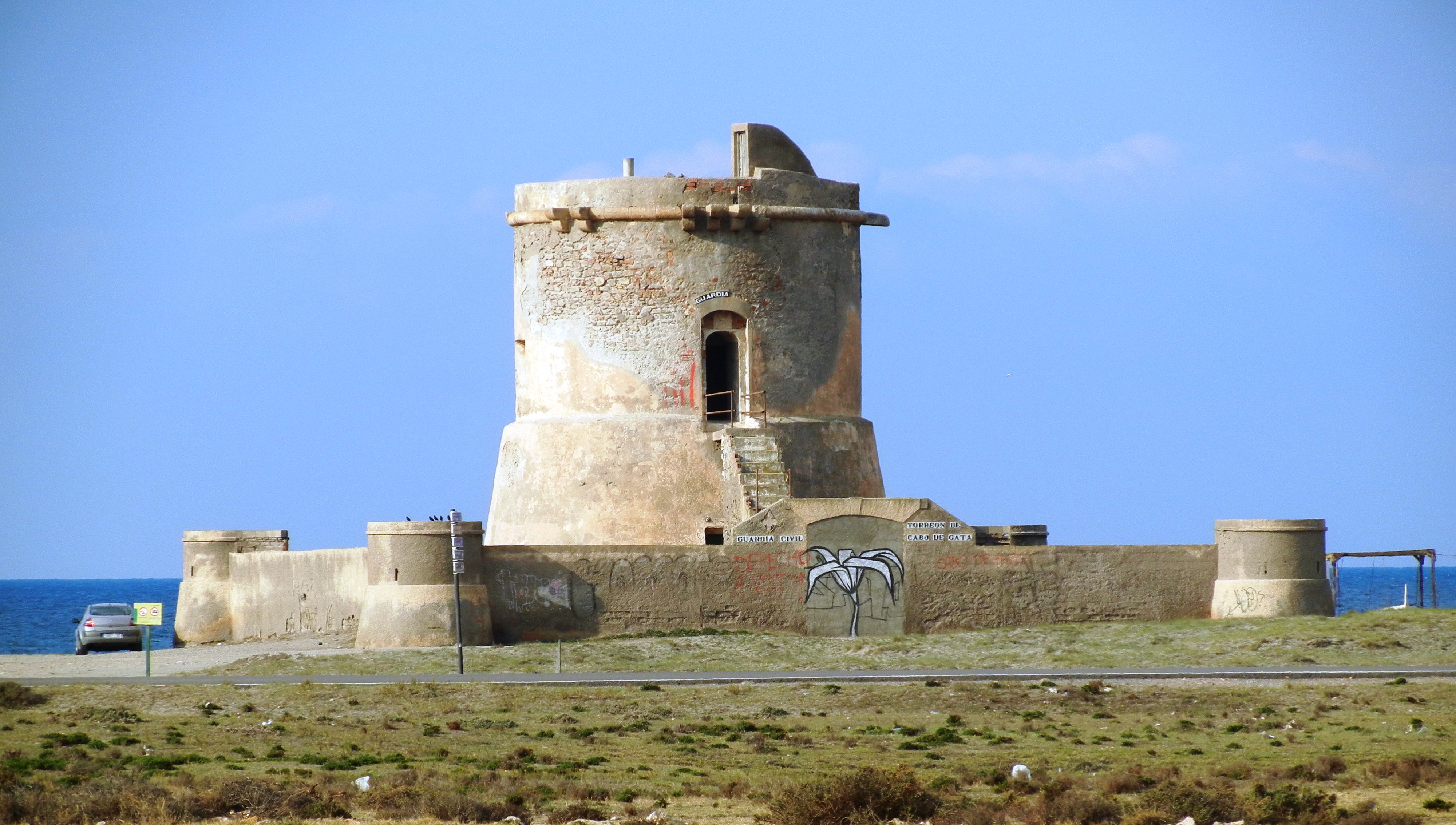 La torre es de propiedad privada, de acceso vedado, una cerca imposible de rebasar impide verla entera, no creo que eliminarla y dejar paso libre la perjudicase más de lo que lo hacen esas horribles alambradas. Tengo que encaramarme a una tapia para observar su bonita silueta troncocónica al completo. Desde este estupendo otero, miro lo que he dejado atrás, la visión es sencillamente espectacular, alcanza a englobar esta esquina peninsular al completo. Contemplo la bahía de Almería en toda su extensión: un tremendo semicírculo deja ver el playazo recorrido, más acá de la capital y al otro extremo del golfo las colmenas de edificaciones turísticas de Agua Dulce, primero, y Roquetas de Mar después. Si tuviese un telescopio podría alcanzar la imponente fortaleza de Santa Ana en Roquetas, asistida muy cerca por el torreón desmochado de la playa de los Cerrillos, que carcomida su piedra aún conserva la figura enhiesta, y el torreón derruido de Almerimar, apenas un majano de piedras amontonadas en la playa, completando el sistema defensivo.