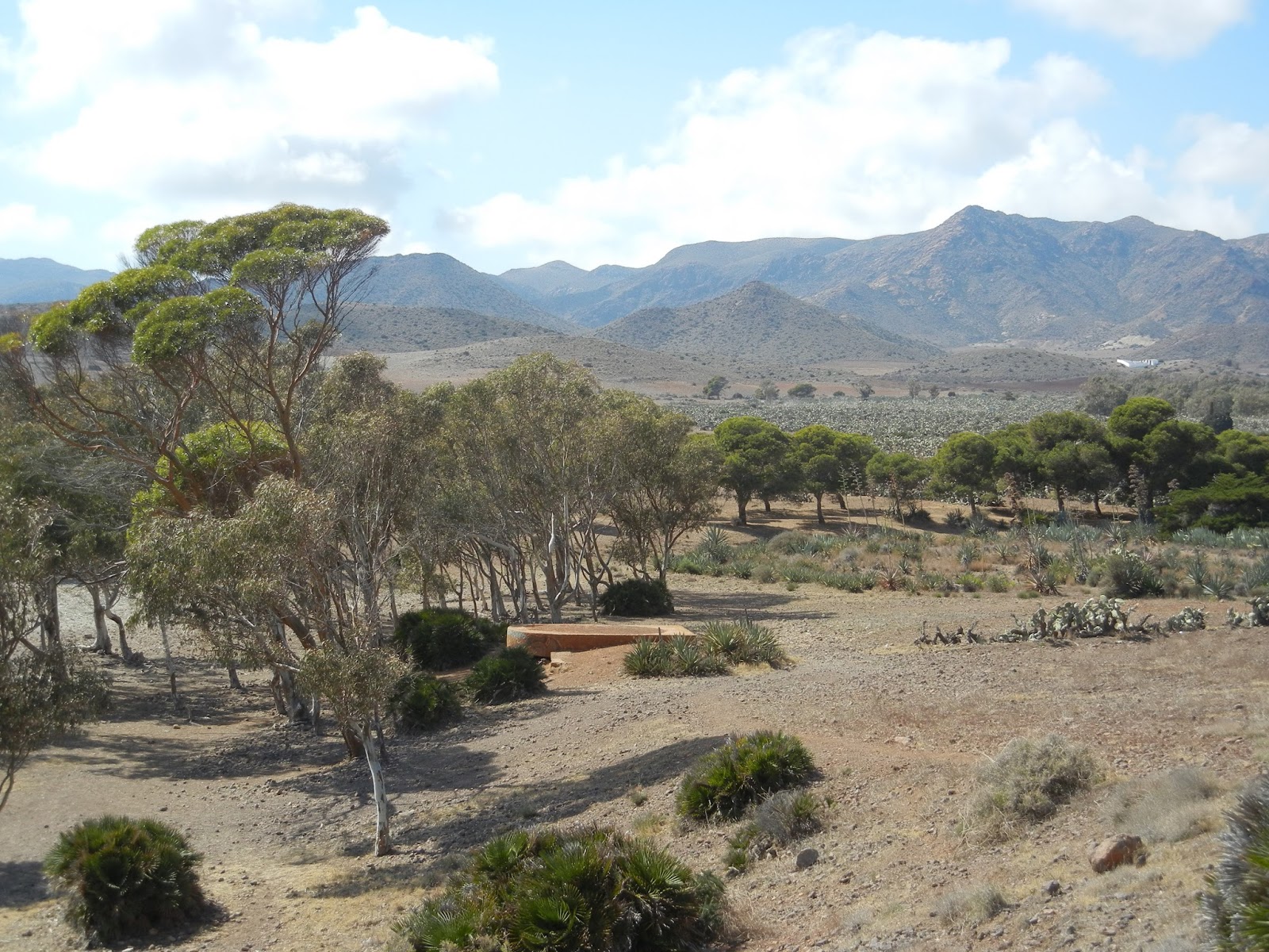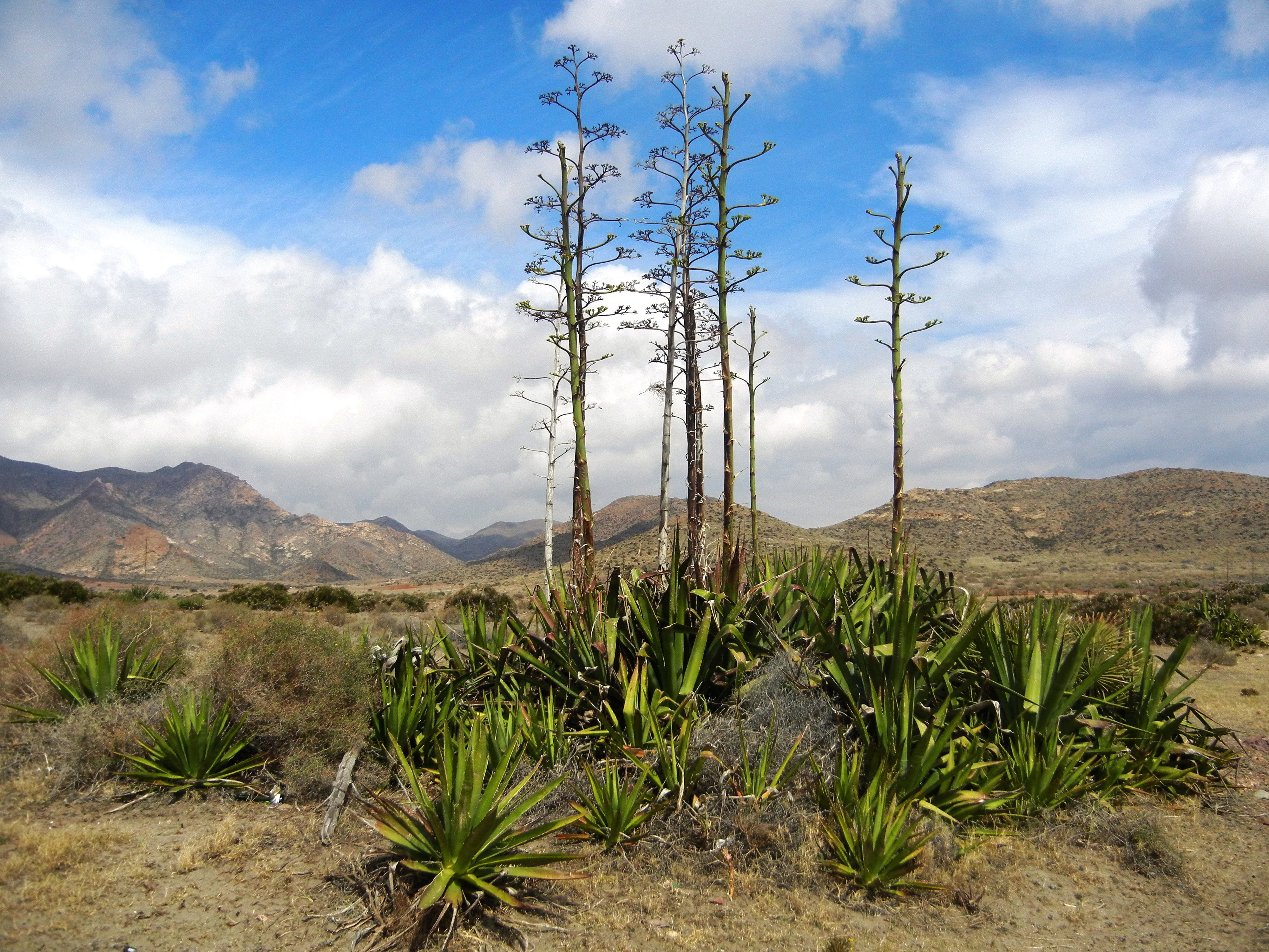 Me llama poderosamente la atención la gran plantación de chumberas –con cercas de agaves o aloes- sembradas en cuadrícula que ocupa una extensa hacienda abierta la playa, desentona con la apariencia agreste de estos terrenos. Estas plantas tan vinculadas a la típica imagen almeriense, a la postal mil veces vista, no son autóctonas, fueron importadas desde Méjico en el XVIII como productoras de colorante (merced al parásito que las coloniza), forraje para el ganado y alimento humano con el higo chumbo. En la actualidad la proliferación desmesurada de la cochinilla, su parásito blanquecino, una especie de telaraña, que se utiliza para obtener un carmín natural usado en cosmética, está arrasando las plantaciones andaluzas y murcianas (según leo en La Opinión de Málaga y en la Voz de Almería). Tampoco el aloe, conocido como aloe vera, interesante por sus múltiples usos medicinales, el agave americana (del que extrae el tequila y el mezcal) ni otros componentes de la familia de las agaváceas como el henequén, el mezcal, la pita americana (utilizadas sus raíces en cordelería), y un largo etcétera, poblaron estas tierras hasta fechas recientes, fueron traídos debido a sus aprovechamientos industriales.