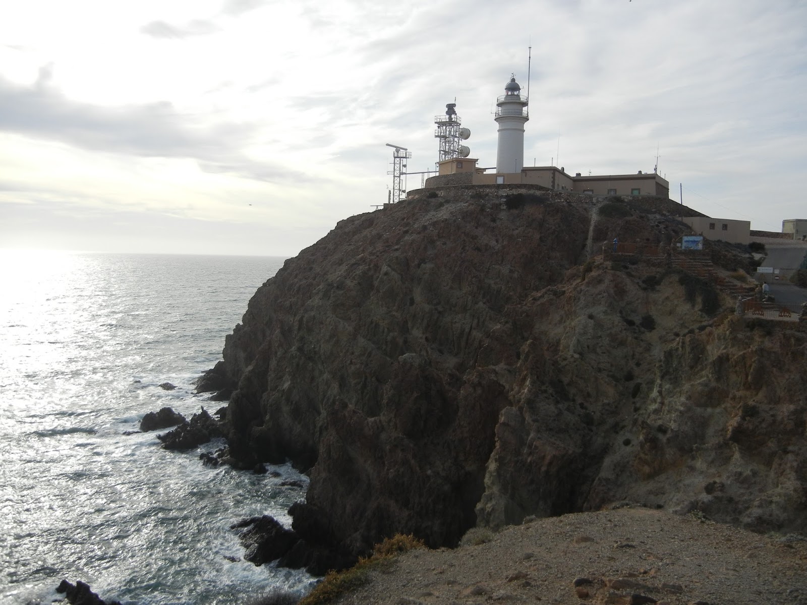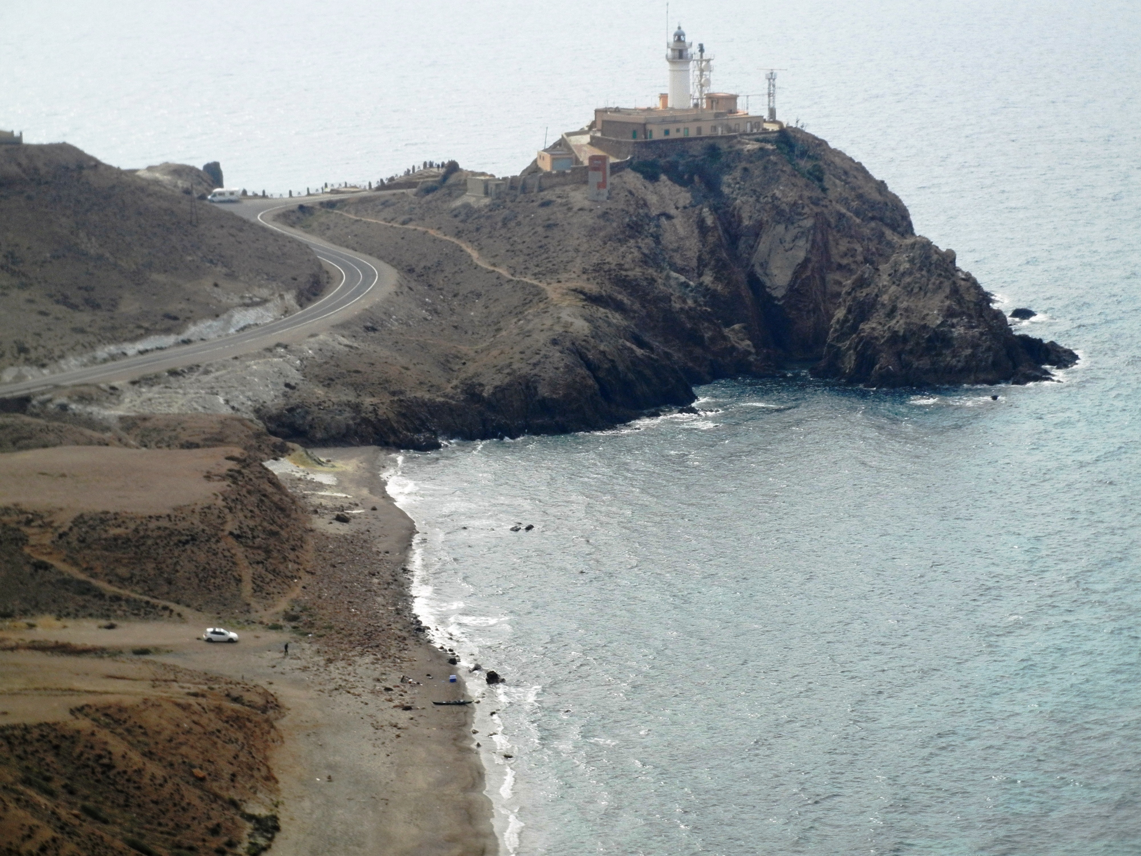 Diviso la torre de la Vela o de la Sábana Blanca, así llamada por aparecer una beta de roca blanca, que tiene forma de velero, en la pared del acantilado sobre el que se encarama. Dicen que ayudaba a orientarse a los marineros que atravesaban el cabo, que incluso se ve en noches claras. Es otra huella del vulcanismo hidrotermal, el brusco enfriamiento de las cenizas volcánicas al contactar con el mar produjo variaciones en su composición química y las blanqueó. Observando el zigzag de la carretera que conduce hasta ella calculo una media hora para llegar. Existe también otro camino, en realidad un proyecto de carretera abandonado antes de completarse: parte desde un restaurante o merendero con una gran piscina (igualmente abandonado) sube medio kilómetro por la falda de la montaña, se interrumpe por lo abrupto del terreno y continúa un poco más allá por la ladera unos 1500 metros más hasta enlazar con la carretera, esta sí se completó, que llega a las antenas de comunicaciones de la Vela Blanca. Permanece como una cicatriz abierta, sin suturar, un desgarro en la superficie de la tierra, la trinchera a cielo abierto de la desigual contienda que libra el ser humano con la naturaleza. Un despropósito tras otro, y eso que nos encontramos en un Parque Natural Marítimo y Terrestre, Reserva de la Biosfera (1997) inscrito en la Red Mundial de Geoparques Europea (2001) y mundial (2007) por la UNESCO.