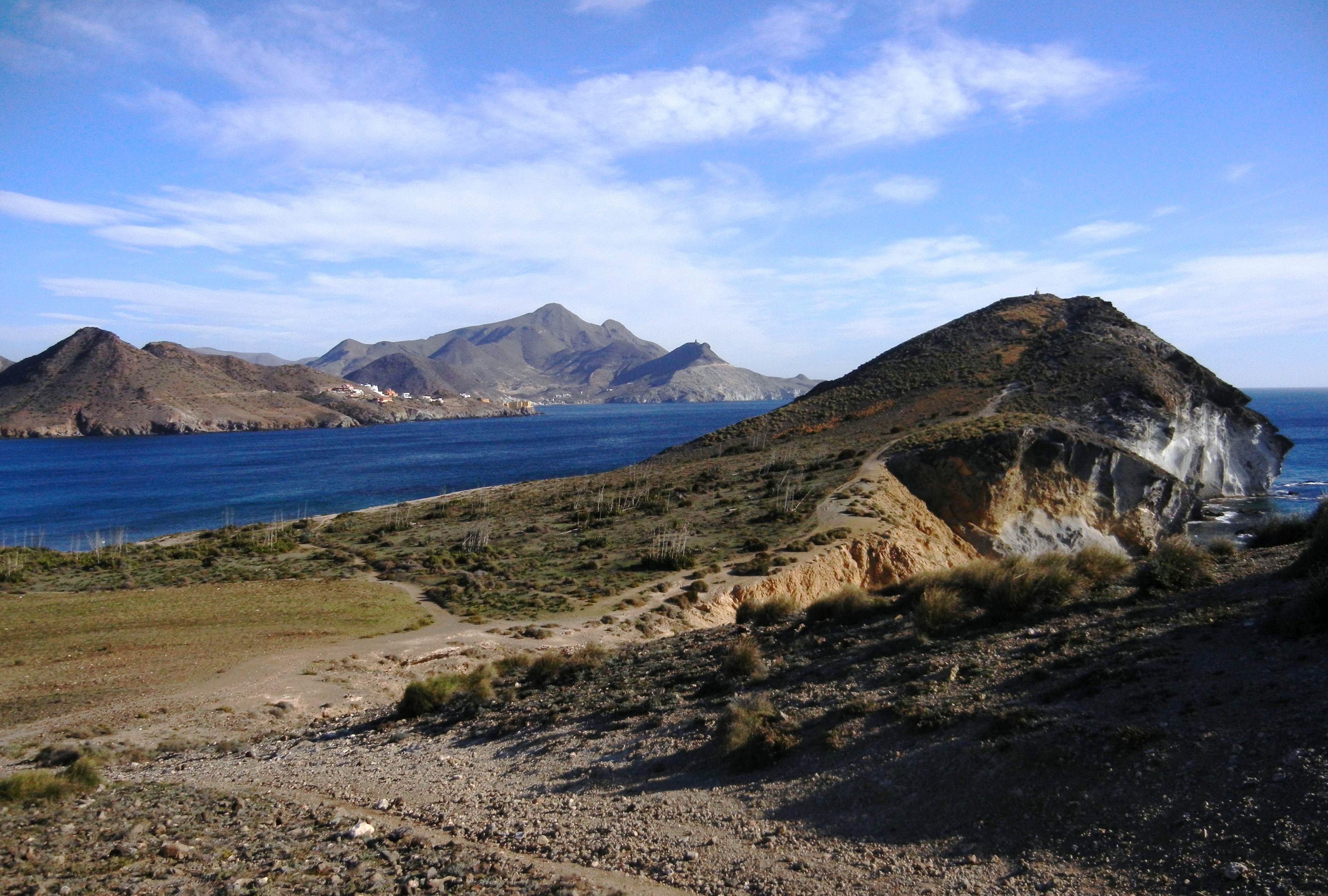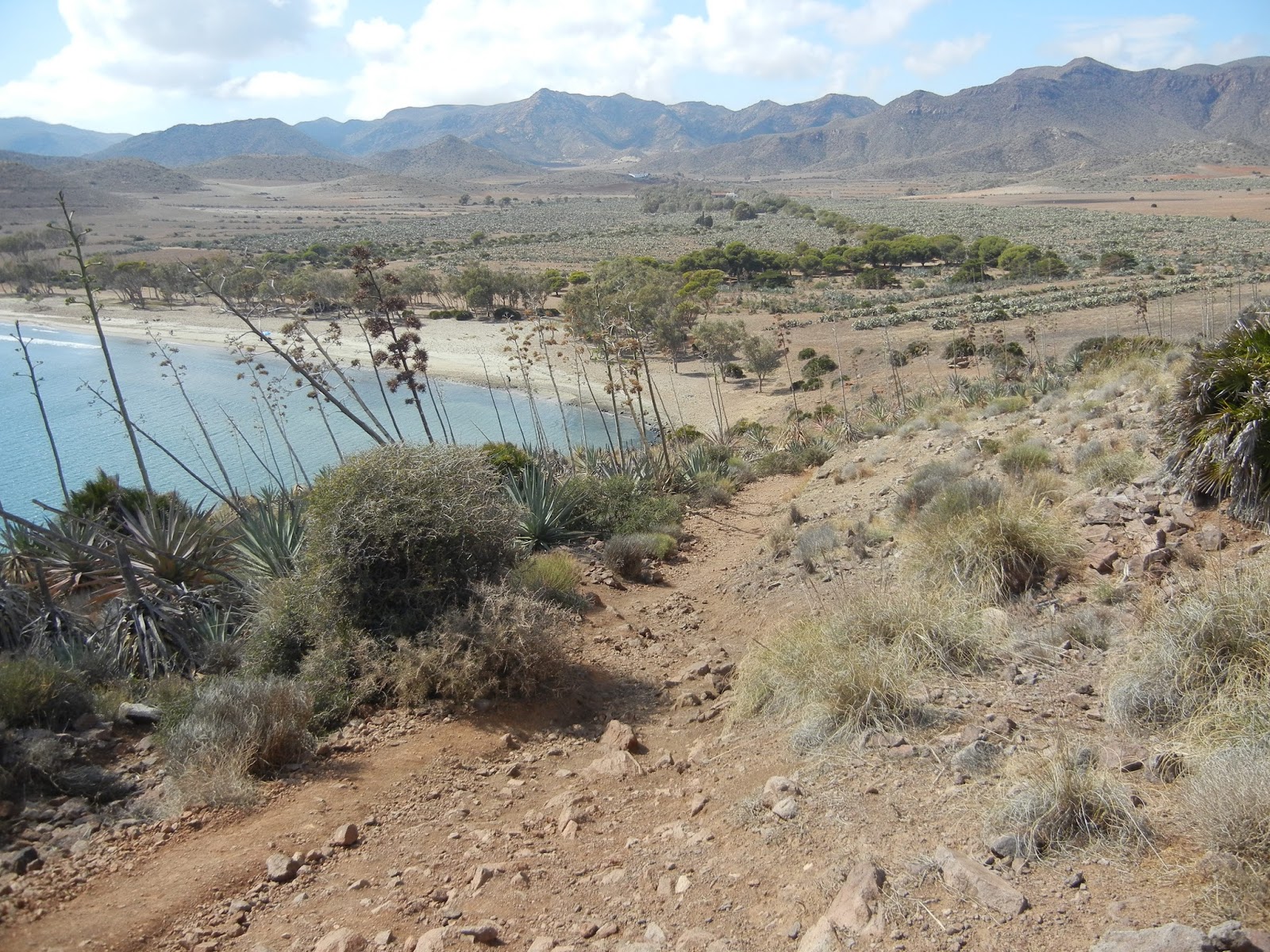 Al poco de iniciada la caminata reparo en que existe un atajo por el interior que toma un camino en pendiente, atraviesa cerros y ondulaciones para llevar a través de Valle Perdido (precioso y evocador nombre) hasta el mismo cabo de Gata e incluso más, remontando unos cuantos cerros, hasta la bahía de los Genoveses. ¡Deben estar preciosas las praderas en altura que se ocultan entre ellos, rebosantes de colores con miles de florecillas! Me planteo ir por ahí, acceder a esos ocultos secretos, pero sería adjurar demasiado pronto de mi propósito costero, de mi afán por no perder de vista el mar en ningún momento. Fijo la mirada pues en el hito que supone la torre de Las Salinas y continúo con mi ritmo cansino pero vivaracho. A ratos vuelvo la cabeza para comprobar mi avance desde el torreón de San Miguel a mi espalda, ya casi no lo veo, me he alejado definitivamente de la casilla de salida, es menor la distancia que resta para llegar a la Almadraba de Monteleva, que la que llevo, no hay vuelta atrás.
