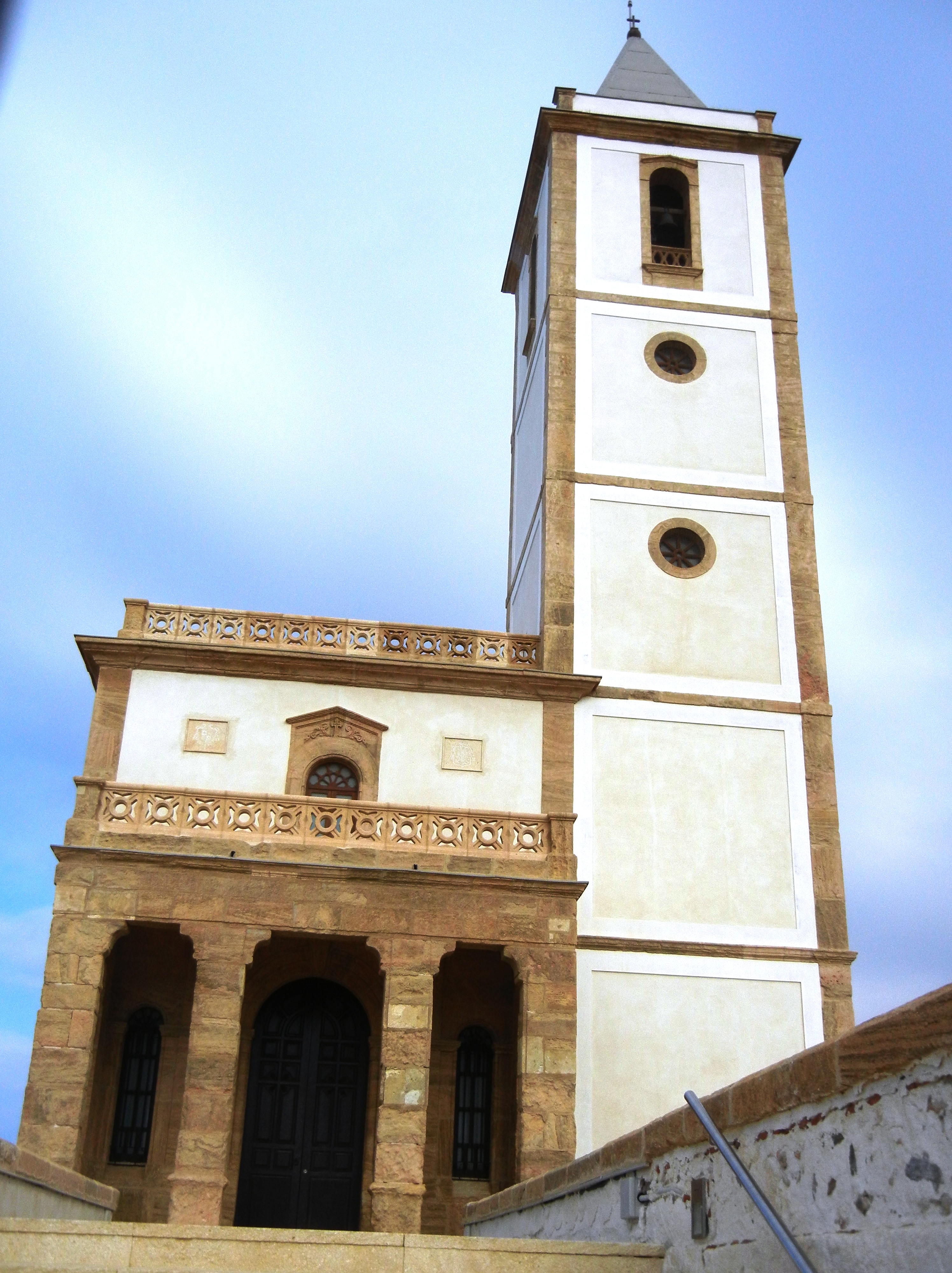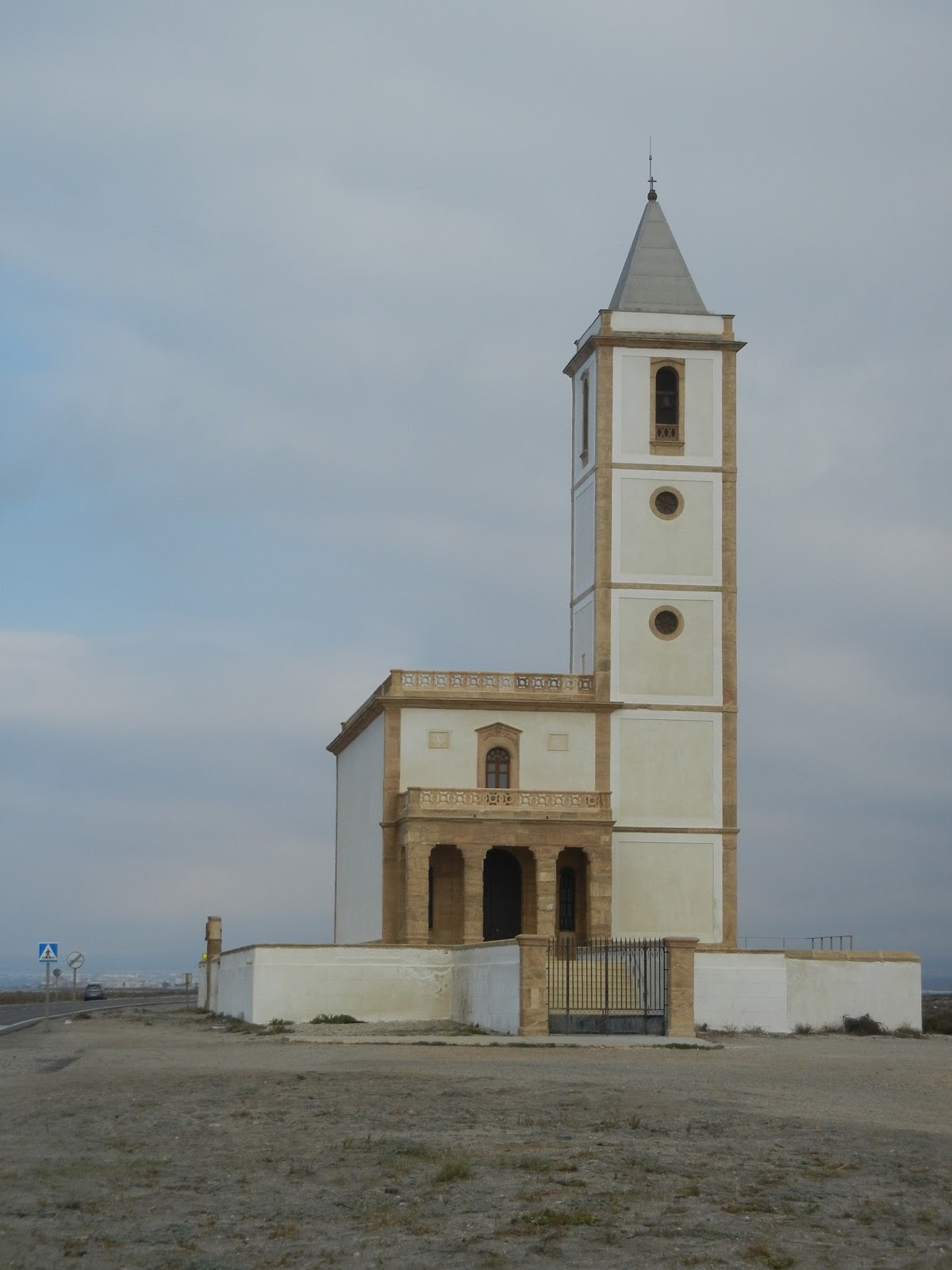 Me acerco a esa torre, citada ya en 1501 como torre de Craçia, entre torre de Alquyan y el fortín de cabo del Gata según las crónicas. Es de origen islámico, exenta, sencilla, con un reborde insinuado a modo de cornisa, en realidad parece un vaso boca abajo con engrosamiento en el culo, está restaurada. Se divisa una entrada en alto que precisaría de añadir una escalera, alguna ventana y una tronera en horizontal. Adosado figura un azulejo que la representa y una placa conmemorativa de 1940 aludiendo a un milagro, en la que más o menos se puede leer: Ave María, el 21 de diciembre de 1502 trajeron aquí las aguas milagrosamente la imagen de la santísima virgen del mar que el vigía Andrés Jaén testigo de su venida recogiera en esta torre (…) y se llevó a la ciudad de Almería (…) era aclamada (…) en 1806 patrona (…) Santuario en 1953. Se refiere a la aparición en la playa de una imagen de la virgen tallada en nogal que se guarda en la preciosa ermita hexagonal de El Toyo, muy cercana, pequeñita y tan vistosa como una tarta de merengue, pintada de amarillo, donde el segundo domingo de enero se celebra una romería con dicha virgen, patrona de Almería, una escultura gótica de estilo valenciano o catalán procedente de algún navío naufragado o asaltado por entonces.