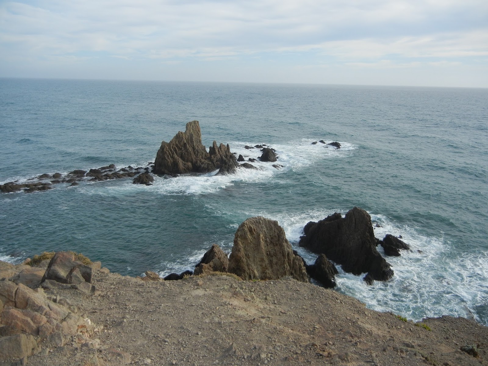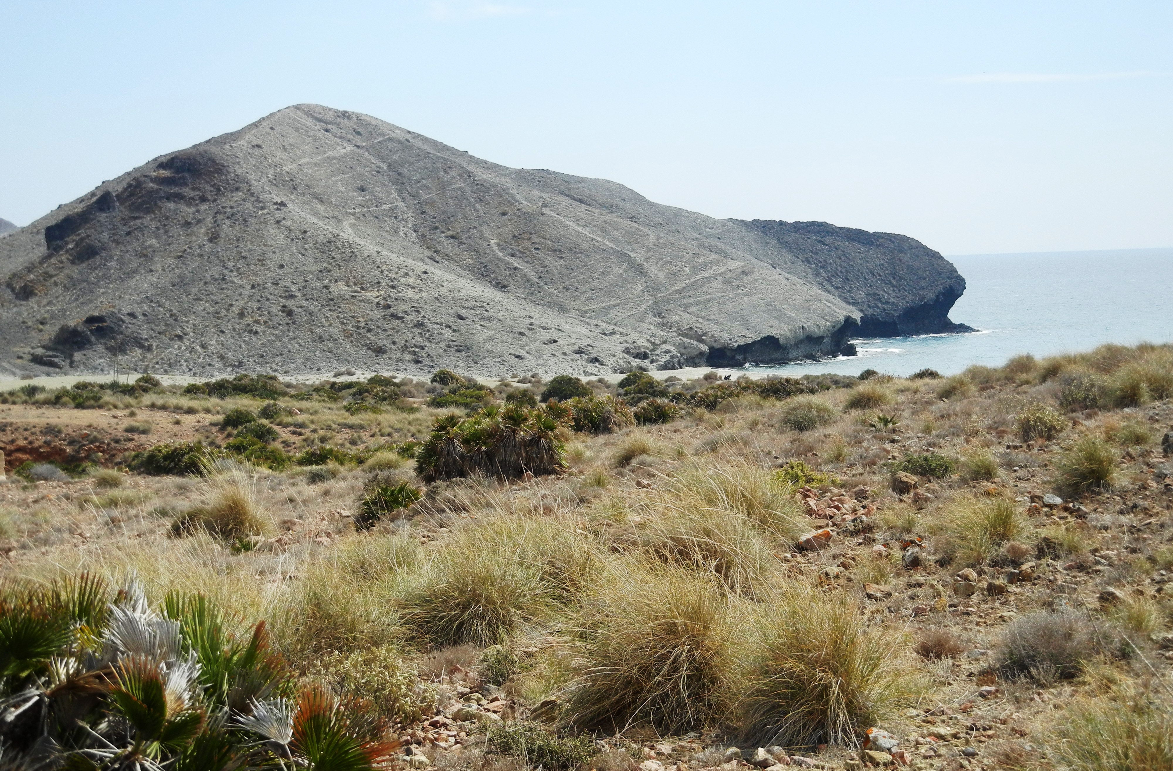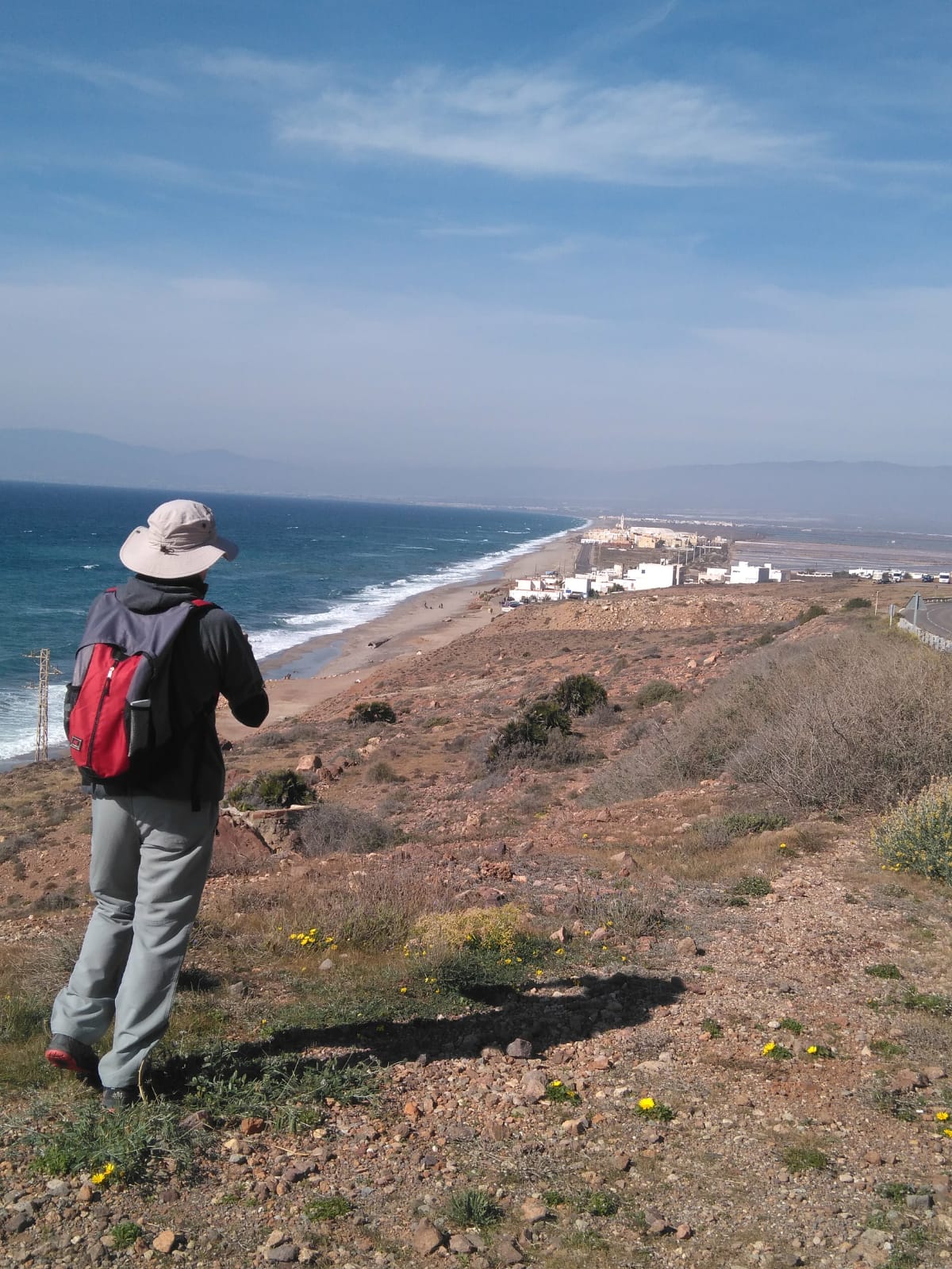 En la otra dirección, hacia levante, a mi izquierda, la vista alcanza el peñón oscuro de Las Negras, la imponente altiplanicie de la Mesa de Roldan e incluso, ajustando el enfoque, sobresale una alta chimenea industrial más allá que no quiero ver. Me quedo, sin embargo, observando los detalles costeros de las varias etapas próximas que me aguardan, recreándome en su análisis desde esta privilegiada atalaya.