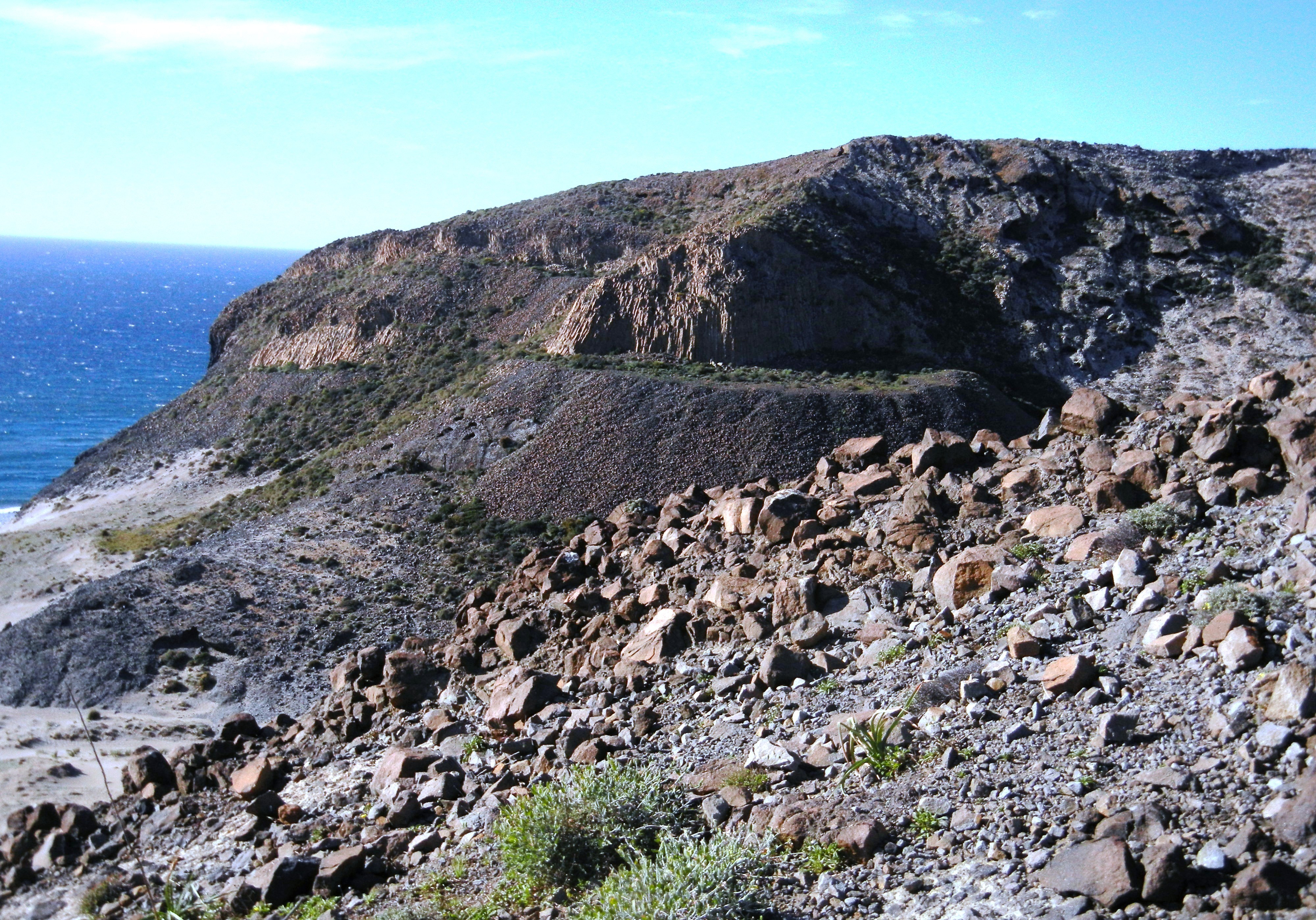 Me asombra encontrar el emplazamiento del faro a tan baja altura, mejor hubiera sido situarlo más adelante en el lugar que ocupa la torre de la Vela, por ejemplo, que además domina tanto la costa por el lado de levante como por el de poniente. Es cierto que la cala del Corralete, donde se halla, servía de refugio a los navíos cuando soplaba levante y de reposo antes de afrontar el arriesgado paso del cabo, era complicado de pasar debido a la seca, un bajío (le llamamos también bajo, viene a ser un resalte del fondo, una pequeña isla que no llega a salir a superficie) a media milla y a solo diez pies de fondo. Desde una calita pequeña, más adelante, veo Punta Baja, se aprecian pequeñas columnas basálticas de lava que se enfrió bruscamente, produciéndose grietas y cristalizando en tubos hexagonales, una Calzada de los Gigantes irlandesa en miniatura. Sus fragmentos constituyen duros adoquines aprovechados durante épocas pasadas para el pavimentado de las ciudades.