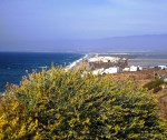 Diviso a lo lejos, junto a los invernaderos de plástico que amenazan con invadirlas, unas dunas en el paraje conocido como Las Amoladeras. Me dicen que sobre ellas cabalgó hace ya mucho tiempo una caravana de camellos capitaneada por el apuesto teniente inglés sir Peter O´Toole, transmutado en intrépido Lawrence de Arabia. Parece adivinarse todavía emergiendo entre las reverberaciones que forma la calima sobre ellas. Más adelante tendré ocasión de contemplar otras pétreas, verdaderas dunas fosilizadas en la playa del Monsul y en Los Escullos y… Sirvieron también estas arenas de improvisado desierto egipcio en algunas secuencias del accidentado rodaje de Cleopatra (1962) de Joseph L. Mankiewicz.