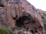 Unas marcas blancas y azules (sendero local), al terminar el descenso, me guían sin necesidad de seguir el camino, acortando el trecho. Llego a la playa de Mónsul, Monsón o Monso, poseedora de una codiciada fuente (aunque algo salobre) que los corsarios berberiscos apreciaban para sus aguadas, así como el resguardo de temporales; su importancia estratégica hizo que tuviese buena dotación de soldados defensores que habitaban en una cueva, hasta diez hombres, pero nunca se llego a levantar una torre.