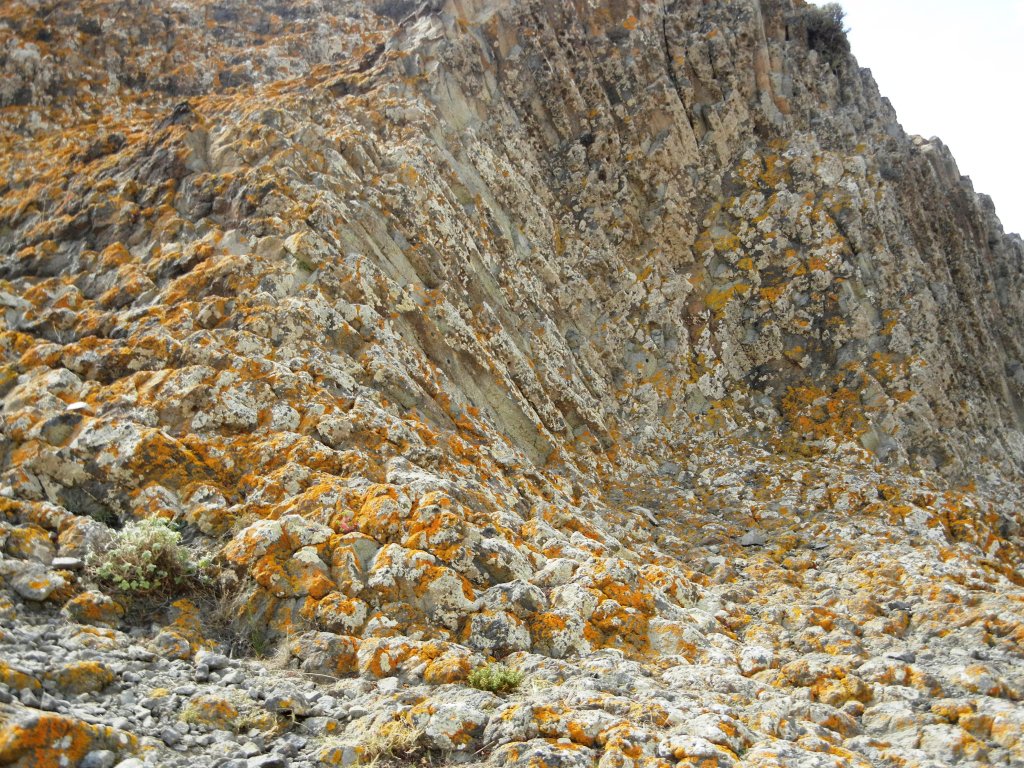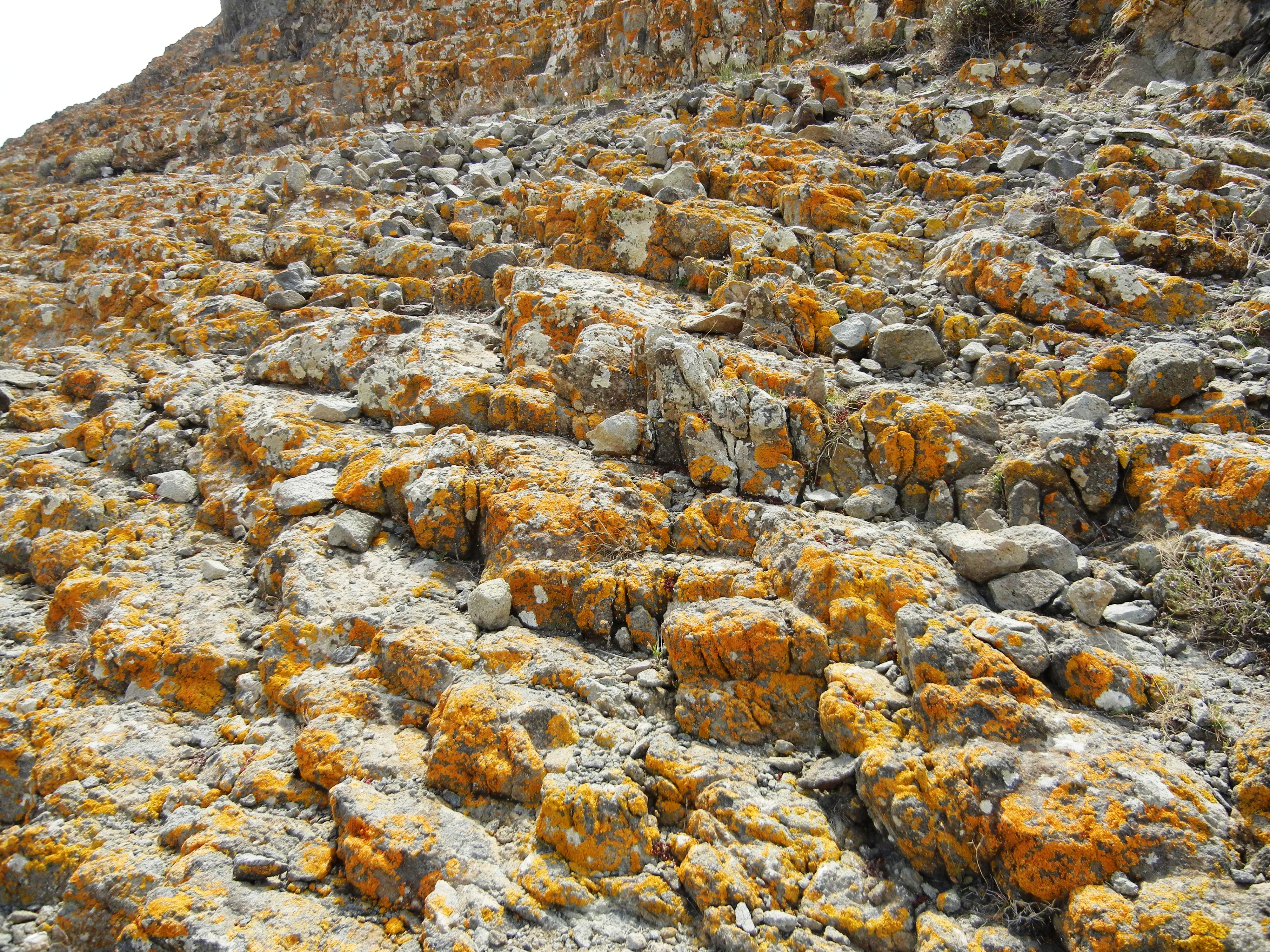 Dejo estas cinematográficas arenas ocupadas por algunos visitantes -surfean en seco varios subiendo a lo alto de la duna- y me encamino hacia el cerro del Barronal donde erupciones volcánicas sucesivas, superpuestas, han dejando cantos angulosos de diferentes tamaños envueltos por una pasta fina del mismo material consecuencia del enfriamiento de una lava viscosa y gruesa. Las diferentes coladas que se enfriaron enseguida dibujan una ladera escalonada de estratos que unos preciosos líquenes ocres han tapizado por completo dándole una apariencia irreal, espectacular.