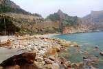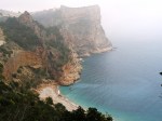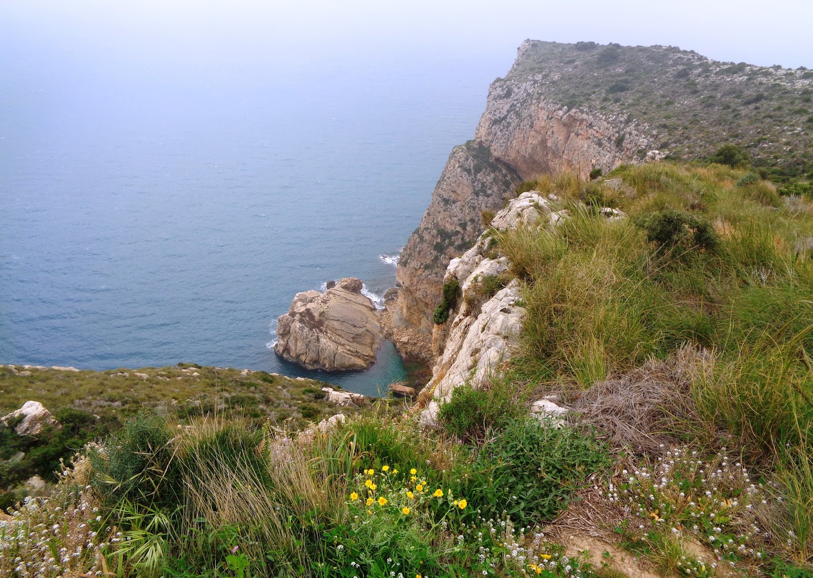 Diviso, hacia el norte, en un clareo que permiten las nubes, el trozo de costa conocida como Les Morres, muy apropiado cuando se contempla ese territorio ocupado por acantilados, tajaduras, islotes, puntas, playas encerradas, cabos, y una serie de calas salvajes inaccesibles por tierra entre cantiles calizos impresionantes que superan los cien metros de altura. Sé que existen senderos en algunos tramos, aunque la mejor opción, no teniendo acceso con embarcaciones para ir de uno a otro, es descender y caminar, allí donde se pueda, los tortuosos caminos que se retuercen en multitud de curvas y contra-curvas, en herraduras imposibles, para salvar desniveles de vértigo. Y, donde no, retroceder a la carretera y buscar acceso desde el interior.