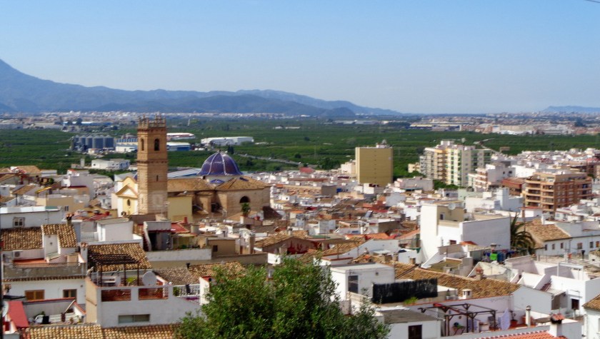 Acometo la ascensión al tossal-Castillo de Santa Ana. Supone, a estas horas de la tarde y con el sol pegando de firme, un auténtico vía crucis, nunca mejor dicho porque en sus empinadas laderas aguardan las casetas-estaciones de uno precisamente. Pero, aunque los restos de la cima son exiguos y pobres, efectivamente la panorámica es excepcional. Abarca todo el Golfo de Valencia: un gran arco desde la Sierra del Montgó, por el sur, hasta la Montaña de Cullera, Valencia ciudad y, aún por encima de ella, las sierrecillas entorno a Sagunto y las de Val D´Uxó. Un tremendo arco de 120 km, 170 si aumentamos la escala y lo prolongamos hasta el cabo de Oropesa, de ininterrumpidas playas y zonas bajas litorales que ofrece unas cómodas etapas, desde el punto de vista del relieve al menos. Asoma la Torre de Les Centelles del palacio condal, función de vigía.