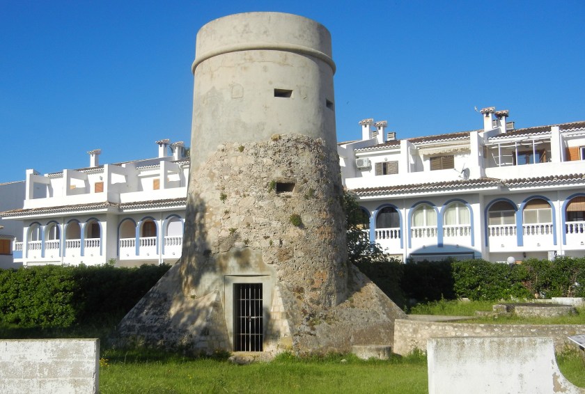 La torre aguarda, efectivamente, camuflada entre viviendas turísticas que la ocultan, donde primero la busqué, junto al restaurante Paquebote, a lado de la gola del rio Girona, un poco al interior, la línea de costa seguramente ha avanzado con los siglos transcurridos. Torre del Palmar, de Pastor o de la Almadraba, se sitúa cerca de un establecimiento agrícola importante, la villa romana de Els Poblets, un conjunto del siglo II o principios del III d. C. con un alfar centrado en la producción cerámica, fundamentalmente materiales de construcción (tejas y ánforas). Aunque ejercía también de vigía costero y protegía, como su nombre indica, la almadraba de pesca, y el punto de recogida de agua del rio Girona anexo en un aljibe, así como restos de almacenes.