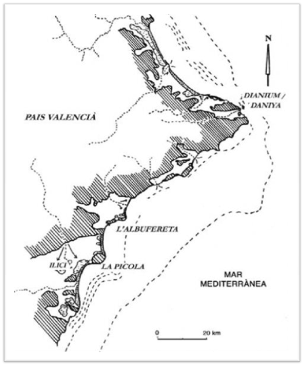 Como se puede apreciar en el mapa adjunto existían sistemas lagunares de gran extensión que se adentraban mucho hacia el interior, a saber: desde Torrevieja a Elche (Ilici) vinculados a los vertidos del río Segura, que no llegaban al mar, y al Vinalopó; desde la Albufereta a Campello relacionados con el río Monnegre; desde Villajoyosa a Altea entre los ríos Amadorio y Algar; de Jávea a Denia, con los ríos Gorgos y Girona, a ambos lados del cabo San Antonio y sierra del Montgó, persiste todavía parte de aquella abundancia conservada como Marjal Pego-Oliva; y aún hacia el norte, hasta Gandía, con el Serpis por el sur y el Marjal de Xeraco y Tabernes al norte; y hasta Cullera, con la desembocadura del Júcar y numerosas lagunas y saladares que alcanzaban hasta la parte meridional de la misma Albufera de Valencia, hoy muy mermada en caudal y extensión, reducida a una décima parte de lo que fue.