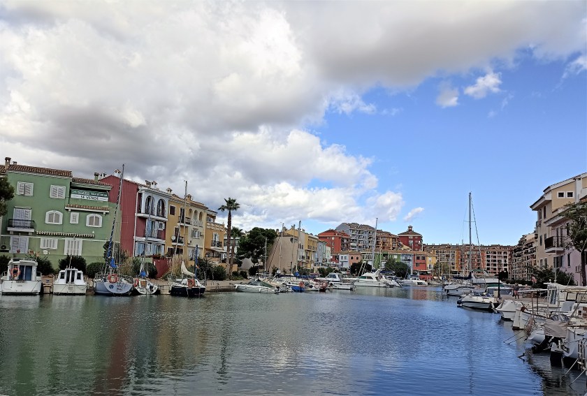 Alcanzo enseguida Port Saplana, donde se revea otro concepto turístico, un intento por prestigiar al veraneante de barquito y yatecito, un remedo veneciano de los canales con chalecitos coloridos y pintorescos entorno, que no palacios. Buen intento, por lo menos rompe la monotonía constructora de las moles descomunales y las urbanizaciones de adosados similares unas a otras. Aunque no colma, se agradece el intento, algo más humanizado y accesible que lo visto y repetido anteriormente.