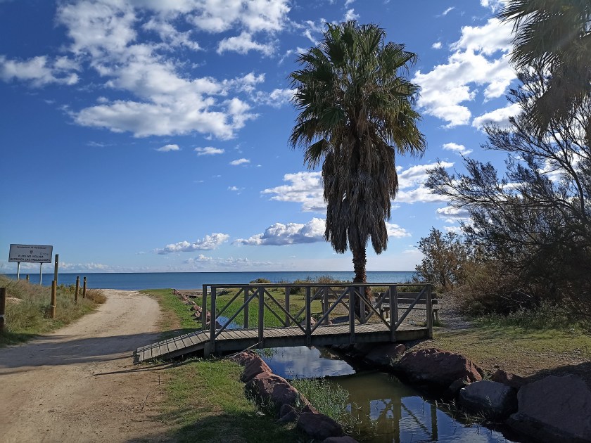 Diviso el Monasterio del Puig a unos kilómetros tierra adentro, al alcance de la mano, de las piernas en este caso; una media hora, de darse bien. Pero vuelvo al mantra del peregrino marítimo que resuelve el dilema que me asalta a menudo: soy marítimo, acuático, ya han comenzado a aparecer membranas interdigitales entes los dedos de mis pies, no puedo virar tierra adentro, aunque esté muy justificado, no debo desviarme, abandonar el litoral, Neptuno se vengaría de mí al alargar en demasía la etapa enviándome agujetas feroces.