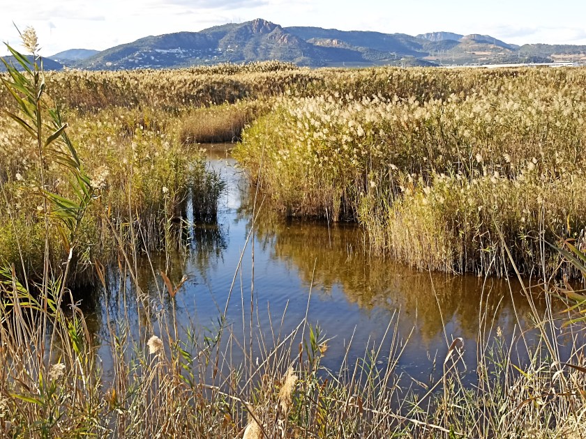 Tras pasar la playa de Puzol, alcanzo el Marjal de los Moros. Un perfecto ejemplo de conservación, con viales, observatorio de aves, pasarelas, miradores, etc. Se originó partir de un primitivo estanque, l’Estany de Puzol, regulado por una gola, situada actualmente en el extremo meridional del marjal, cerrado por una restinga frontal arenosa. Se compone de dos sectores, el de los Moros, de 1 km de ancho por 2,5 de largo al norte y el de Rafael y Vistabella (amenazado por una promoción urbanística). Al sur se prolongaba hasta el río Turia como Marjal de L´Arrif.