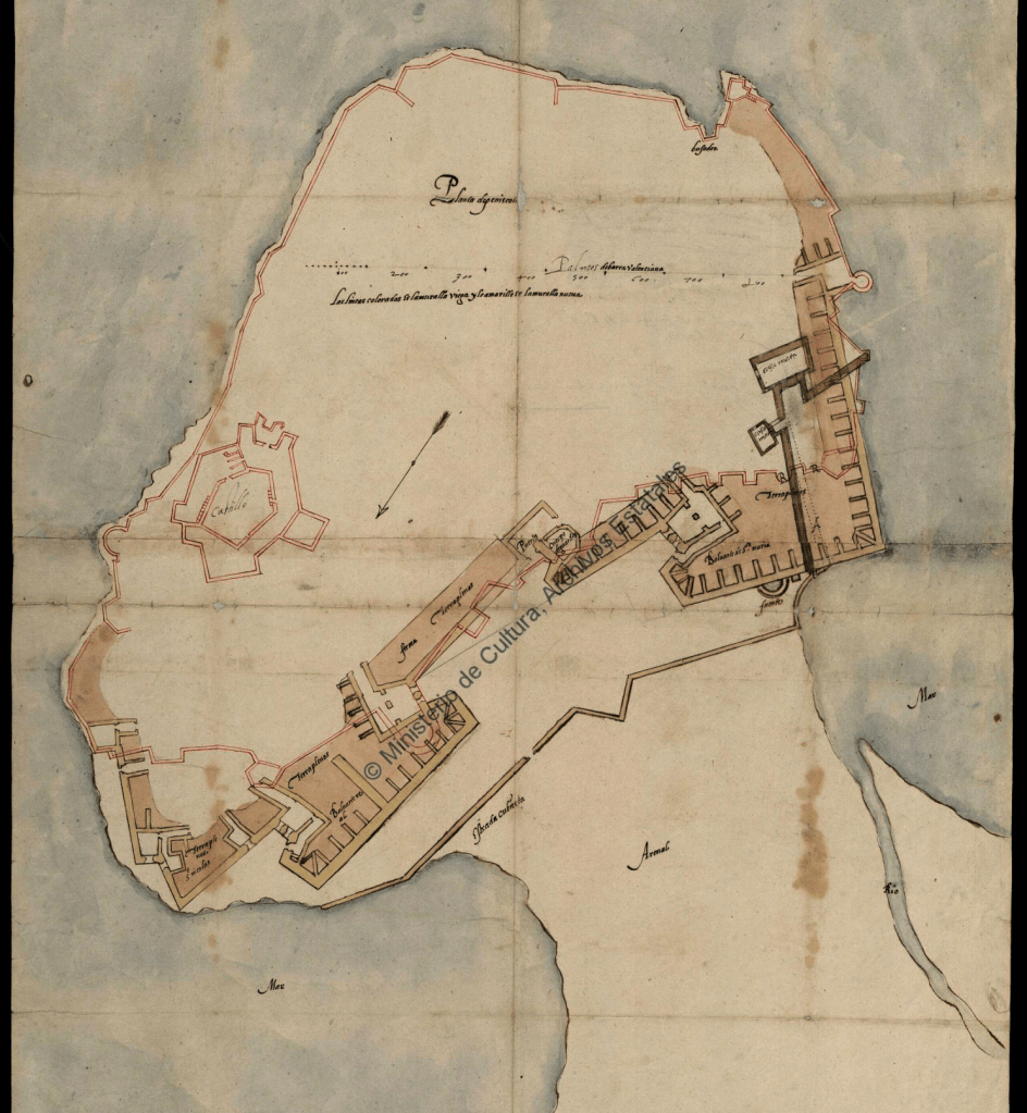 Tengo frente por frente el puerto, su extenso dique de levante alcanza los 400 m. Se construyo en 1922 (anteriormente se amarraban las embarcaciones al norte de la ciudad en La Porteta) y cambió radicalmente la fisonomía urbana haciendo que se ensanche la estrecha lengua de arena del tómbolo. Existieron proyectos desde principios del XVII que por falta de recuerdos y acuerdo no llegaron a ejecutarse a pesar de la necesidad urgente que requería la defensa naval en el norte del Reino de Valencia, inmerso en la guerra con Cataluña. La otra opción, Vinaroz, no disponía de la fortificación adecuada que lo acompañase. Surgieron a raíz de las transformaciones renacentistas que experimentó la ciudad en 1578 tras las obras llevadas a cabo por J.B. Antonelli, arquitecto de Felipe II, de las que trataré más adelante.