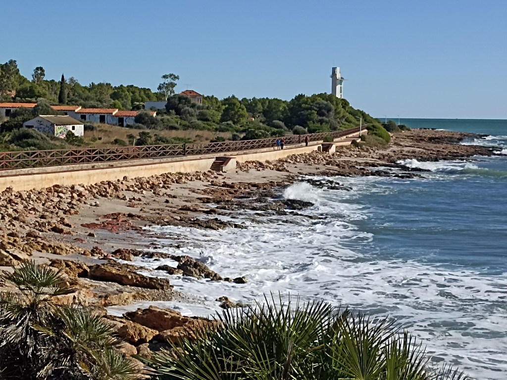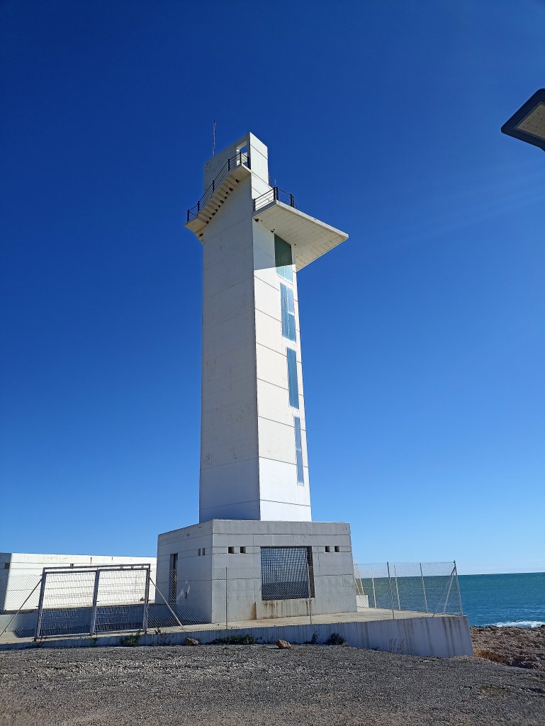 Una vez comprendido el panorama defensivo medieval, desciendo al pueblo. He de aprovisionarme ahora. Junto a la exigua playa almuerzo un bocadillo de sepionet en el bar Maya, como corresponde. En la pared cuelgan varias fotos antiguas en blanco y negro de la zona antes de las invasiones (turísticas) que me hacen anhelar tiempos pasados. Salgo al paseo marítimo, camino a nivel del agua hasta cala Blanca y recorro playa Galarza hasta el pequeño Faro de Irta, apenas a un par de kilómetros de Alcocebre. Es obra reciente el faro, de 1980, de corta estatura y esquemático estilo racionalista; proyectado, según indica la publicidad municipal, por Rita Lorite. Junto con otra arquitecta, son las dos únicas mujeres en todo el litoral español que han ejecutado faros (lo que no debía ser una nota excepcional lo convierten en una anacrónica peculiaridad).