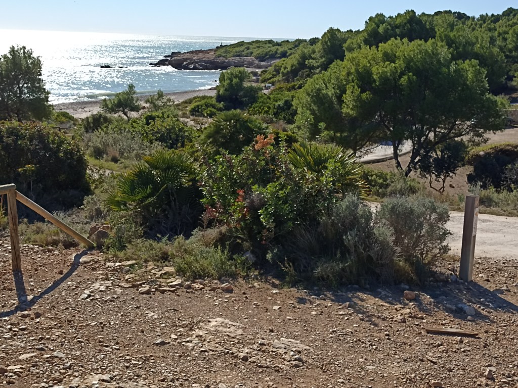 Comienza aquí propiamente el Parque Natural, un continuado tapete arbustivo compuesto de palmito, chaparro, lentisco, brezo, romero, algún enebro, etc., incluso yedra en las umbrías; salpicado y sombreado por pinos carrascos, algarrobos, y algún ciprés despistado, alguna sabina mediterránea, etc. Un recóndito paraíso, una feliz excepción, un lujo para los sentidos, salpicado por una urbanización y unas pocas villas y chalets privilegiados que se levantarían antes de la declaración de parque. Un auténtico bosque virgen mediterráneo al mismo borde del mar hasta la playa de Portonegro, pasada la torre de Al Badum, igual al que se pude disfrutar, pero únicamente en manchones, en Les Playetes de Benicasim. Lo mismo que allí, ocupan la orilla del mar planchas pétreas rojizas horizontales que han sido carcomidas y destrozadas por el embate milenario del oleaje. De resultas de ello, aparecen pedruscos y secciones grandes de costras obstruyendo el acceso al agua. No se encuentran playas hasta que llego a la del Serradal.