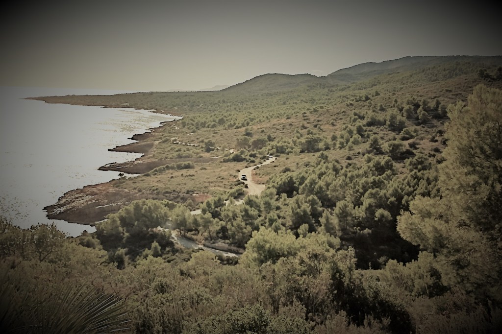 Llevo mi recorrido por el camino litoral, existen senderos que se desvían hacia el interior y buscan las faldas de la sierra, pero no son tan atractivos, algunas derivaciones se aventuran a subirla, hacia la Font d´En Canes por ejemplo. La vía de tierra es cómoda y ancha, transitable para vehículos hasta que se llega a la urbanización Ribamar, con playa delante, existe cerca también un camping. Natural, no se puede desperdiciar tanta belleza y tranquilidad. Después, un poco más adelante, se divisan dos bloques elevados, tienen tres alturas, es la urbanización La Cubana, dos grandes edificios rectangulares de apartamentos, intrusos inmersos de lleno en medio de tan frondosa vegetación. Resulta una visión anacrónica e impertinente. Al llegar, cruzo por mitad de ellos sin dignarme a mirarlos y raudo me adentro completamente en el bosque, todavía más espeso si cabe. Recorro intrincados vericuetos, se va adelgazando la senda, llegándose a perder en algún tramo, lo que me obliga a retroceder e, incluso, atravesar los arbustos pisándolos por donde resulta posible, para encontrar algún vestigio de ella. Resulta difícil moverse, doy vueltas sobre mí mismo, zigzagueo, repito tramos, pero no estoy perdido. El mar, ahí al lado, a la derecha, es una dirección segura. Regreso buscando retomar el sendero donde recuerdo que era bien claro. Hecho mano de la memoria de mis piernas para que me guíen y de detalles vegetales que vuelvo a ver. Encuentro por fin un paso, una derivación que da a un camino ancho que me dirige hacia el interior, sube hacia la falda de la sierra, se aleja de la orilla del mar pues. Me lleva a un cruce con una indicación en una tablilla de madera para senderistas: Font de la Parra. Esa dirección no me vale, es ascendente, me aleja de mi propósito. Me las apaño para cambiar de sentido y enfocar hacia Cala Argilaga. No conviene alejarse nunca de la costa porque donde bajan barrancos, excavados por las torrenteras estacionales, estos ganan en profundidad y, por tanto, dificultad para atravesarse, a medida que se ascienden.