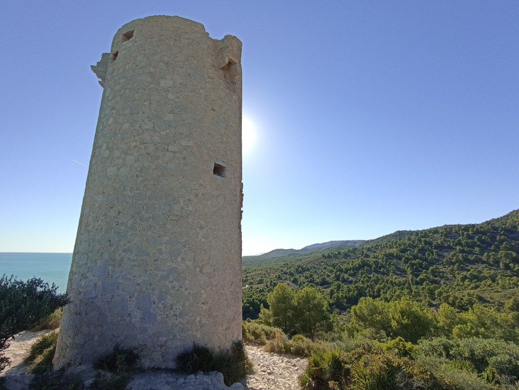 Después de una manzana reparadora y solazarme un rato bien a gusto sobre el peñón, a la vista de tan extensa panorámica como permite dominar, imagino los intentos de desembarco de las fustas piratas, las correrías frustradas que abortarían fácilmente los vigilantes de las numerosas torres existentes en esta parte del litoral. Resulta sencilla y efectiva la defensa cuando abundan los efectivos, torres y castillos, resulta sencilla la comunicación entre ellos y el relieve lo favorece.