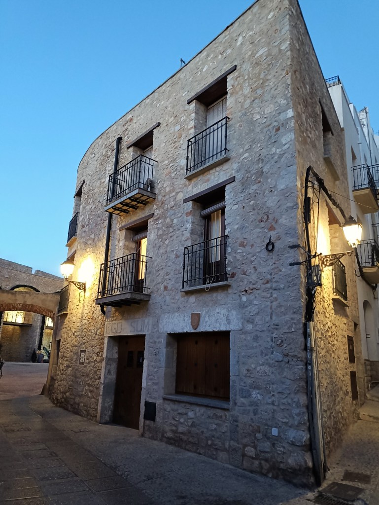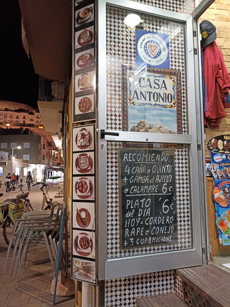 Caso urbano, hotel, ducha y un poco de descanso. Salgo después a conocer Peñíscola. Aunque he estado varias veces, en estancias cortas, ahora lo observo de otra manera. Lo analizo desde un punto de vista histórico, defensivo, profesional, como si después de la caminata realizada hasta aquí y del análisis de su entorno -como un espía musulmán aficionado-, pretendiera asaltarla. De momento, las puertas de la villa están franqueadas, frente a la explanada donde se encuentran la mayoría de restaurantes, ahora cerrados, se interpone la impresionante muralla renacentista, un frente defensivo que abarca desde el baluarte de Santa María hasta el parque de Artillería. Accedo por el portal de Santa María, subo la rampa hasta el portal del Fosc, sobre la puerta luce un escudo de Felipe II y una cartela conmemorativa, da acceso al Cuerpo de Guardia. Recorro las empinadas calles con toda libertad hasta la parte alta de la villa, la Plaza de Armas, donde se encuentra el edificio de principios del XVIII de la Virgen de la Ermita, asentado sobre otro anterior del VI, anexo al castillo del Papa Luna. Sigue el faro, levantado en 1892, cuyo destello alcanza 35 millas náuticas (65 km.) Callejeo, me cuelo por todos los rincones, me detengo en cada mirador, aprecio la consistencia y monumentalidad de las murallas que rodean el antiguo islote, compruebo la inaccesibilidad que ofrecen a un ataque por mar. Me topo con la peculiar casa de las Conchas, con la iglesia parroquial de Santa María. Llego al lavadero, junto a la Font de Dins, uno de los doce manantiales con los que cuenta el peñón, el más caudaloso, que asegurarían continuo abastecimiento, resistencia en asedios prolongados.