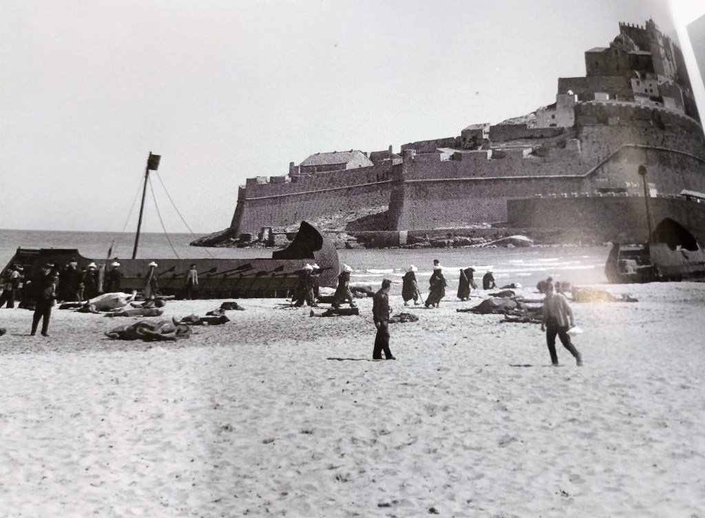 Aprovisionado de belleza y descansado el ánimo, prosigo con el paseo hacia la playa de levante. Entro en una librería, bien dotada, fuera de las murallas. Busco algo que llevarme al diente, lectura para después de la cena cuando ya haya estudiado la etapa del día siguiente. Llama mi atención un libro sobre las películas rodadas aquí, profusamente ilustrado. Me entretengo observando fotos de los rodajes: Calbuch, de Berlanga, en 1956, y, sobre todo, de El Cid, en 1961, de Anthony Mann, marido de Sara Montiel, rechazada para el papel de doña Jimena en favor de la diosa Sofia Loren, con Charton Heston y Raf Vallone. Aparecen fotos de los decorados sobreañadidos al ya de por sí monumental enclave: arcos de herradura y otros elementos musulmanes exóticos, grandes masas de figurantes en la playa (soldados de reemplazo como extras), todo un derroche de medios y de producción. Una proeza por entonces, cuando los rodajes eran tan noticiables o más que la propia película.