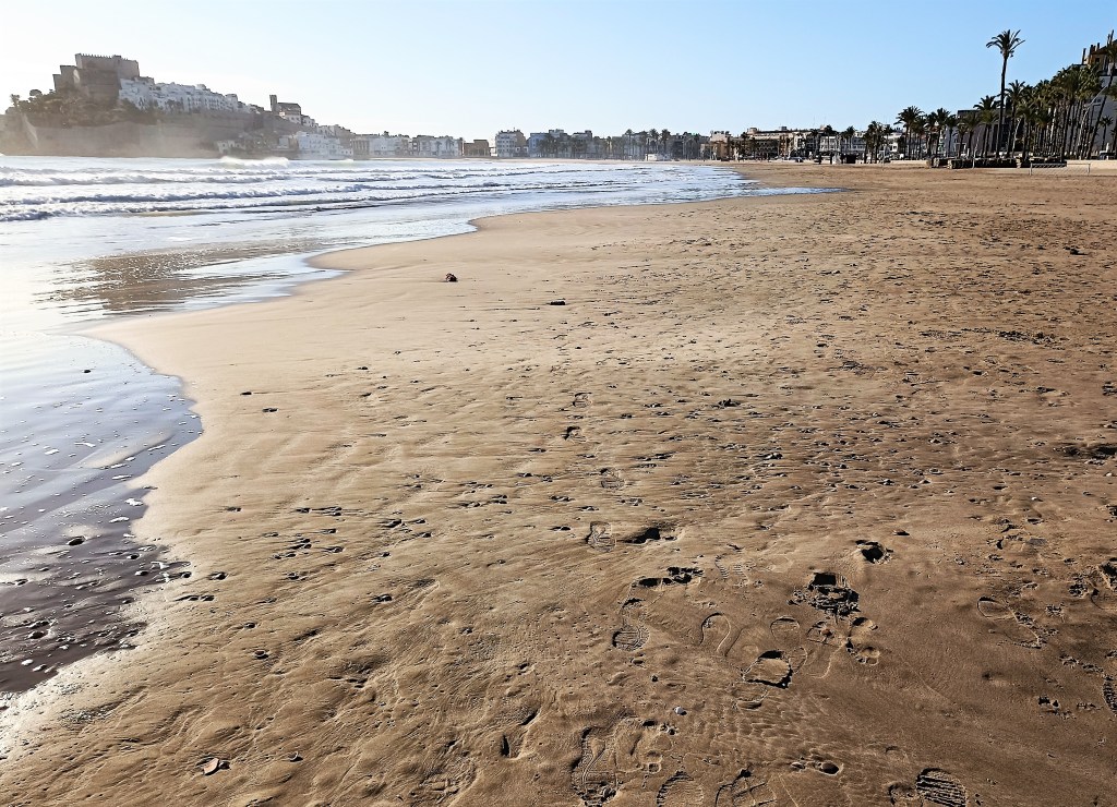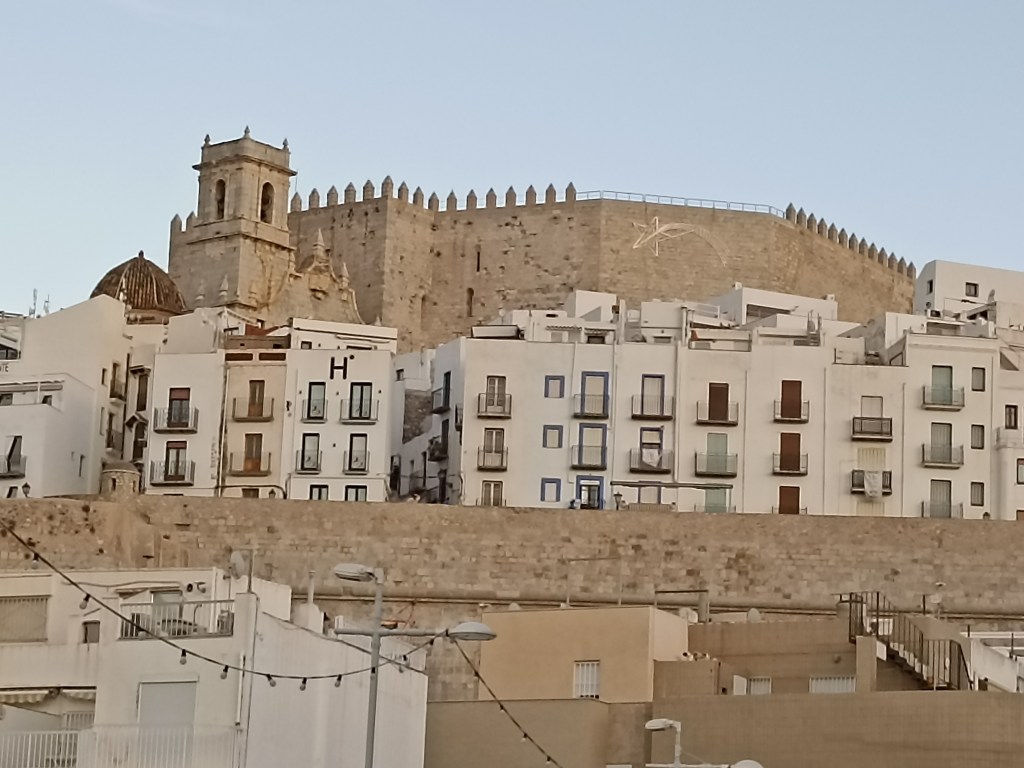 Repaso las fotos para acompañar el presente texto que escribo para la página web, buscando encontrar una panorámica atractiva con la que introducir este artículo y, cuanto más las miro, más veo como se asemeja Peñíscola a una montaña pétrea. Apenas se distinguen las casas cúbicas del roquedal sobre el que se asientan, parecen propiamente una prolongación en piedra de él, consustanciales a la base sobre la que descansan; sus habitantes deben ser trogloditas de superficie. Lo dicho, conquistar ese peñón descomunal se me antoja uno más de los doce trabajos de Hércules. Algo parecido deberían pensar aquellos que arribaron con sus naves por mar ante la escultural mole que se les aparecía delante y les disuadía de intentarlo. No pierde su impresionante presencia un ápice de su porte por más que me aleje kilómetros hacia el norte por su extensa y longilínea playa cuando giro la cabeza para mirarla.