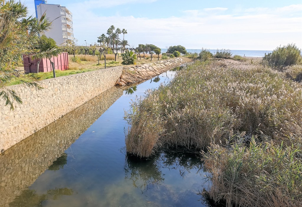 Se produce una ligera discontinuidad en la línea de costa limpia y precisa que traía en estos algo más de 5 km. que llevo recorridos, al llegar a la Punta de Enterra. Da paso, a continuación, a la playa del Gurugú y a la rambla del Barranquet, que trae en su curso bajo una buena porción de agua que no llega a desaguar en el mar, por tanto tengo paso a pie. Se la conoce también como Rambla de Alcalá (de Xivert) y viene desde el lado oeste de la sierra de Irta trazando un recorriendo paralelo a la costa, buscando un hueco entre tanto edificio por donde salir al mar.