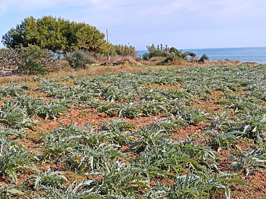 Pero predominan los atractivos campos de alcachofas, extensos y rectangulares como campos de futbol, al borde del mar. Surgen las matas poderosas como estrellas de aloe, como sabrosas estrellas de cardo, con gruesos tallos y hojas hermosas, como hojas de acanto dignas de ser inmortalizadas por el cincel de un escultor griego en un capitel corintio. Explotan las plantas de cartxofes reventando sordas desde el interior de esta fértil tierra, madurando en este atípico otoño, por caluroso, prontas a ser recolectadas.