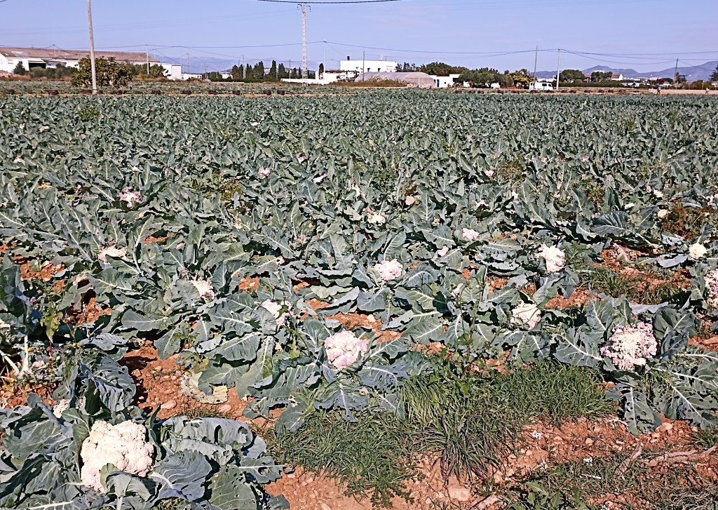 También aparecen en esta esponjosa tierra rojiza algunas plantaciones de coliflores, con los blancos florones surgiendo entre la abundante pámpana. Parecen ramos de novia de apretadas florecillas blancas entre un ese suculento follaje verde. En la mayoría de las parcelas ya han sido recogidas, pero restan algunos frutos rezagados que envejecen espigándose, tomando un hermoso tinte violáceo.