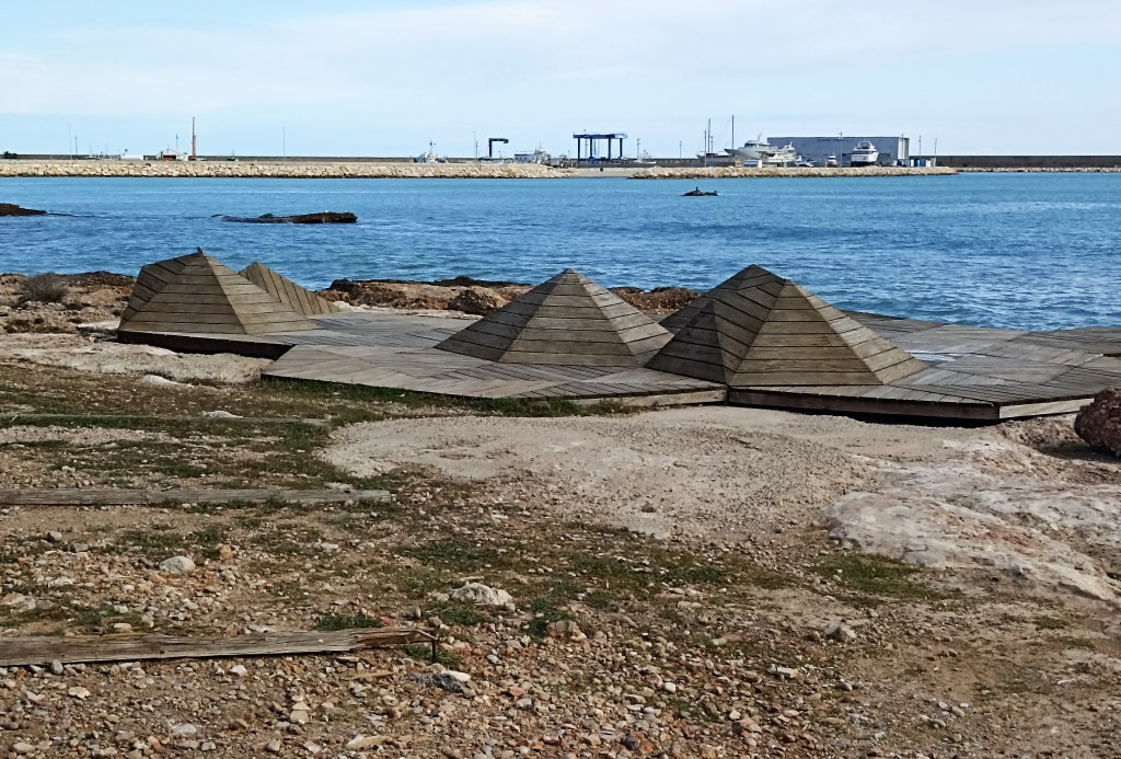 Veo cercano el puerto de Vinaroz, llego a sus inmediaciones, se me ha hecho sencilla y cómoda la etapa de hoy. Paro antes de entrar al pueblo en la punta junto a la cala de Les Roques, encuentro un islote de estructura de madera y tablas, colocadas sobre los roquedos que configuran la costa a modo de solarium. No hay posibilidad de playas por aquí. Como unas mandarinas y me recupero. Se suceden escuetas calitas que apenas permiten tomar el sol y acercarse al agua, compartimentadas por salientes rocosos. Es el Clot, justo antes del muro trasversal del puerto. Pasado este y hasta llegar a la desembocadura del Río Cérvol, al norte del pueblo, a base de escolleras lineales y en forma de T, se ha conseguido despejar un kilómetro de territorio, con arena aportada supongo, que simula una playa. Más hacia allá continuará la misma tónica: calitas entre roquedales, costras de piedra y escalones, que no se abren en playas. Hasta pasados unos 7 u 8 km. Es cuando el marjal, que intenta prolongarse todavía, se asoma a la orilla y forma un arenal, precisamente llamado la playa del Marjal, cerca de las Casas de Alcanar, pero esa será otra historia, otra etapa.
