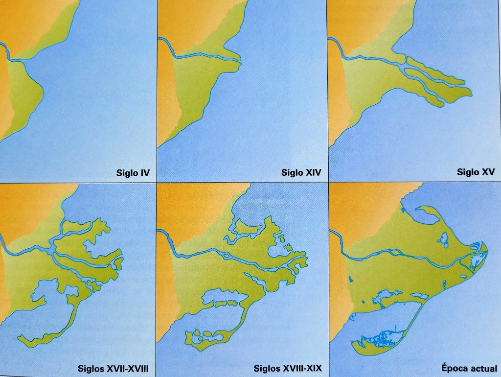 El proceso de conformación del territorio que describe este el gráfico nos ilustra sobre el suelo ganado al mar a base de arrojar y acumular sedimentos siglo tras siglo en la desembocadura, ir conformando lenguas de tierra, cordones, que crean charcas, lagunas, que se van rellenando, cerrando y consolidando. Sorprende el avance tan reciente en términos históricos, geológicos, de ese proceso. La desforestación de los márgenes del río lo favoreció enormemente, como se verá.