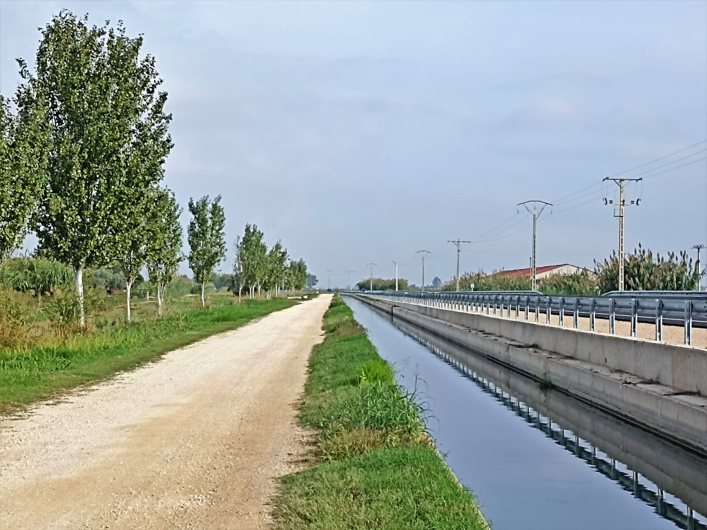 La visión delante se antoja, en todo momento, como un afinado estudio de perspectiva de los que aparecían en nuestro cuaderno de dibujo del bachillerato, con todas las líneas rectas perdiéndose en el horizonte, confluyendo en un hipotético punto de fuga que todavía no alcanzo a ver Amposta. Corren paralelos para unirse en el infinito:la sucesión de postes metálicos que sustentan el tendido eléctrico, la carretera y sus líneas blancas pintadas, los quitamiedos metálicos de su lateral, las paredes de hormigón del canal, el blanquecino camino de tierra que ando, la fila de chopos similares en altura y las paredes vegetales que ribetean el otro canal excavado que da paso a las huertas.