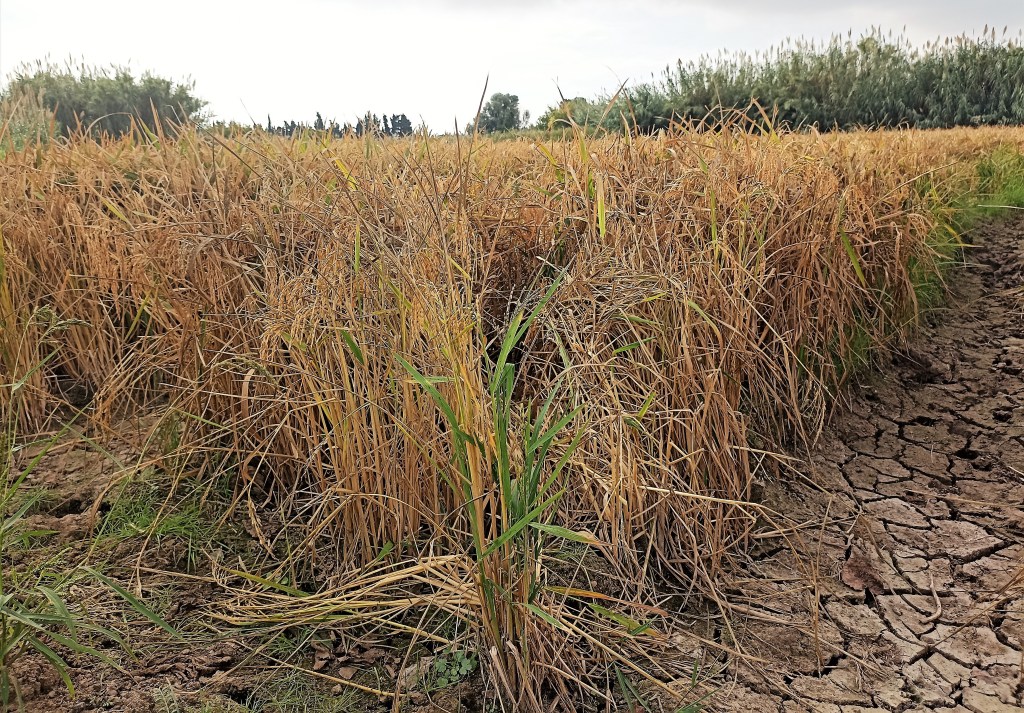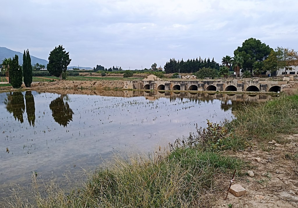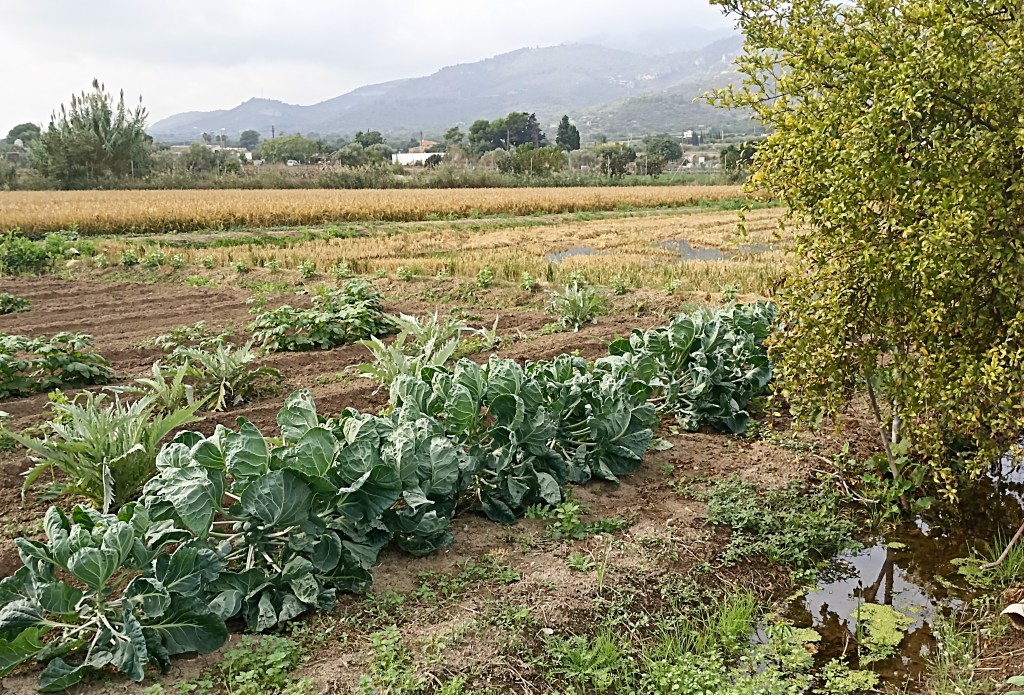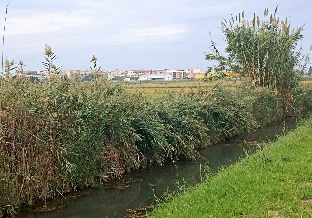 Intento distraerme observando a unos operarios que faenan en la carretera, realizan obras de acondicionamiento para insertar fibra óptica subterránea. A la izquierda, a unos pocos metros, transcurre el canal natural, este de márgenes terrosos, cavado a pico y pala, hondo, escoltado por eneas y carrizos, productivo de árboles y sombras, lindero con esas feraces huertas tan hermosas del otro lado. Lo cruzo por un puentecillo que aparece para observar más de cerca los cultivos. Bajo los frutales, granados e higueras, reverdecen lozanos los cardos, las coles, lechugas, habas incluso. Serpentean en las acequias de riego hilillos de aguas mercuriales. Huertos de olivos con sus buenas copas también. Permanece todavía alguna parcela con el arroz bien dorado,gordezuelo, rezagada, a la espera de ser cosechada. Saltamontes, grillos, gusanos, mariposas, avispas, libélulas, caballitos del diablo y demás bichejos se dan un festín. La artillería de mosquitos, en toda su variedad de tamaños y armamentos, sigue con su incesante patrulleo, sigue ensañándose con un servidor (nunca mejor dicho) sin piedad. Vida menuda abundante, vida vegetal renovada, reluciente de sus colores, vitalidad por todos lados, más de la que pudiera pensarse en cultivos de otoño. La naturaleza revive, se renueva tras los calores del verano en una especie de primavera otoñal.