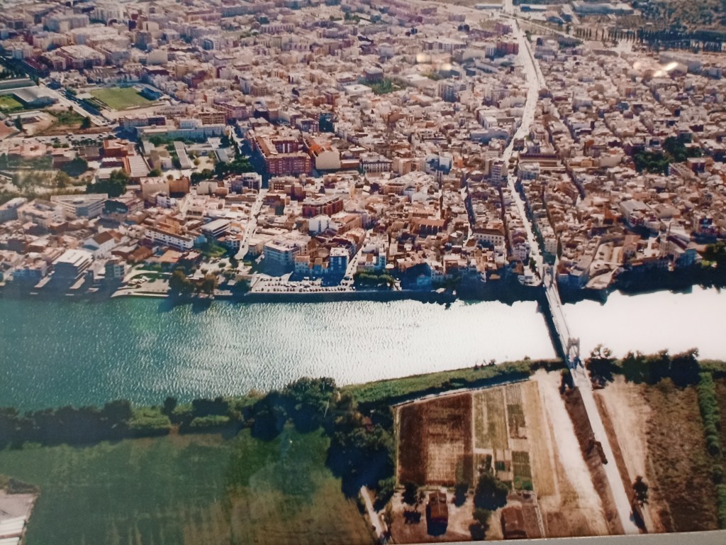 Amposta es la capital de la comarca del Montsià, que ocupa la mitad inferior de la flecha, se sitúa en la orilla derecha del Ebro, lado sur. Al otro lado, margen izquierda, cruzando el Puente Colgante, nos encontraríamos en el Baix Ebre, cuya capital es Tortosa, ubicada 15 km. río arriba, que fue el puerto fluvial primitivo (correspondía al asentamiento de la supuesta Hibera citada en las guerras púnicas, sobre la que fundaron los romanos su ciudad).
