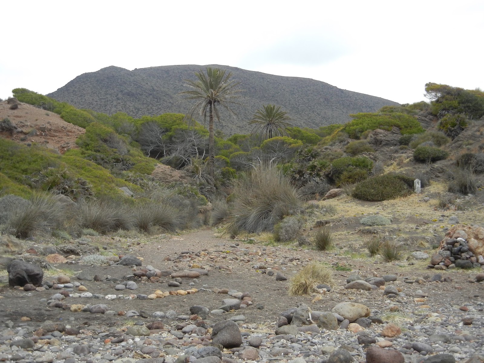 Llovizna, hay una luz sostenida, en absoluto deslumbrante como ayer, ideal para hacer fotos. Hace un día perfecto para caminar, con una temperatura agradabilísima. Hoy he de afrontar una etapa hasta Las Negras, al menos, aunque decidiré sobre la marcha. Me asaltan, en tramos humedecidos por las recientes lluvias, olores intensos, acres, que golpean la nariz con contundencia. Son olores de solares de ciudad, de parcelas vacías de edificios, de descampados. Ese olor peculiar tan fuerte que creía urbano, asociado a escombros y a desperdicios orgánicos, a basura y a plantas en descomposición; pero que compruebo pertenece un mismo suelo humedecido varios días.