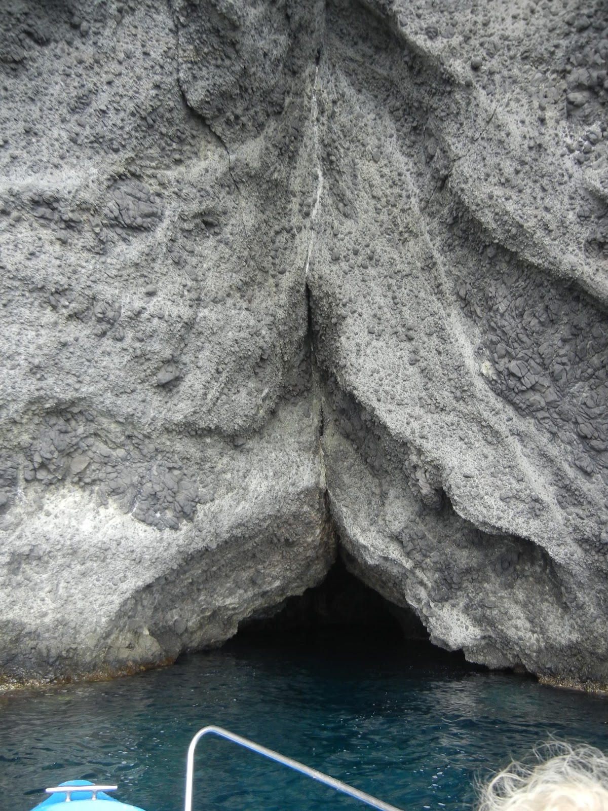 Mientras tanto nos ha ido acercando al moro del paredón negro de acantilados que da nombre a la aldea, para enseñarnos una cueva, en realidad una oquedad de apenas unos metros, que se abre a ras de superficie. Arrima la embarcación con cuidado, nos pide que agachemos la cabeza y se introduce limpiamente por el estrecho resquicio que lleva a un escueto habitáculo, lo justo para poder girar la embarcación y salir. Observo los fondos rocosos que blanquean las cristalinas aguas a apenas unas brazas. Le digo que con gusto me daría un baño y los bucearía un rato, pero lo dejamos para otra ocasión. A la salida de la gruta le pido detenerse para hacer unas fotos, le saco también a él, me llama la atención lo enrojecido de sus ojos y lo aniñado de su cara imberbe a pesar de que debe rebasar la veintena. Bien mirada la entrada de la gruta en el visor de la cámara aparece como un nítido tajo vaginal sobre la pared.