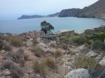 Sobre un elevado promontorio, a la izquierda, destaca la perfecta silueta de la Torre de cerro Lobos, encima del cabo conocido como Punta de la Polagra en referencia a una roca puntiaguda que emerge de la superficie del mar, visible solo si se está embarcado (en latín polacra alude a un barco de dos o tres palos). Encamino mis pasos por el carril asfaltado, no llega a ser carretera, que conduce hacia ella. La torre fue construida, como tantas otras de este litoral, en el siglo XVIII a raíz del estudio defensivo elaborado por el mariscal de campo Antonio María Buccarelli para Carlos III. Se ha restaurado recientemente para habilitarla como faro, también se le han añadido antenas de telecomunicaciones. Mientras almuerzo y contemplo los peligrosos cortados bajo mis pies, estudio con detenimiento el terreno venidero. No tengo la completa seguridad de que haya senda hasta la cala del Playazo, aunque parece adivinarse a tramos una en la ladera de enfrente, ¿o es mi vista la que lo imagina? La otra opción sería rodear unos paredones amesetados que aparecen hacia el interior, supondría un enorme gasto de esfuerzo y de tiempo (debiera haber tomado quizá el camino desde Rodalquilar por el interior, pienso ahora, pero así es la aventura, a menudo se rige por impulsos más que por certezas). Si me equivoco lo pagaré caro. Decido descender hasta un rellano en que parece apuntarse la salida de la sendita en cuestión, con la dirección que pretendo. La tomo y compruebo que se hace más clara conformo avanzo, eso indica que es transitada a menudo. Buena señal. Por fuerza ha de llevar a la cala del Bergantín, incluso más lejos. Ya más relajado considero la belleza virginal de estas laderas que confluyen en un intrincado barranco de arbustos abajo. Prosigue la trocha a media altura con la promesa del terreno de abrirse en una perspectiva marítima de escarpadas paredes o, con suerte, de unos palmos de arena. Estos territorios tan solitarios, esta poderosa sensación de olvido y desarraigo, este gozoso aislamiento que busco, me encuentra a mí antes.
